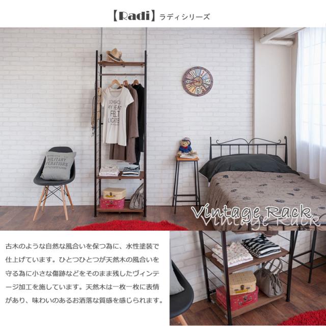 ■商品について/ヴィンテージな風合いの棚板を使用した『Radi』ラディシリーズ。突っ張り式で高い位置まで棚板をセットできるタワー型。棚板を10cm間隔で好みの位置に自由にセットできる楽しい家具。ディスプレイ空間とハンガーラックで見せるワードローブなどオシャレな店舗風にお部屋をイメージ。棚板はライン入りのデザインがオシャレで、杉材の天然木ならではの節・木目が雰囲気漂い、アジアンにも西海岸テイストにもはまるオシャレアイテムで自宅をカフェ風に。同素材で仕上げたキューブBOX【Dice】ダイスシリーズ、棚が浮いたイメージ突っ張りラック【Move】シリーズも是非!
