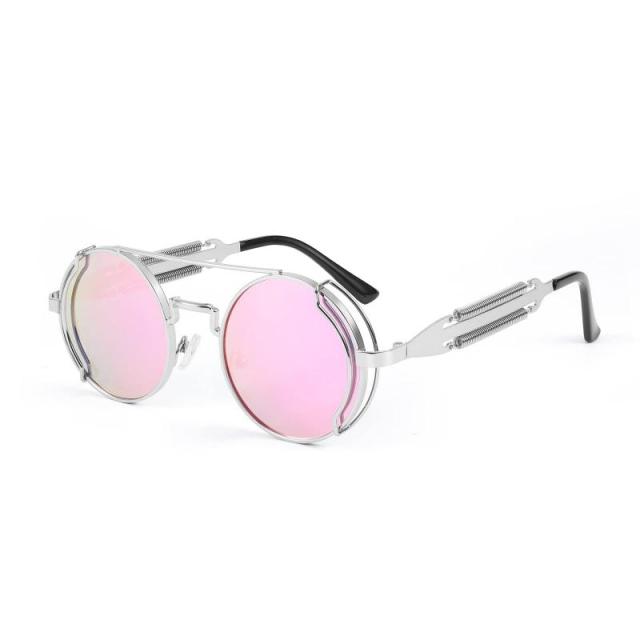 [Karsaer] サングラス レディース スチームパンク 丸形 紫外線カット ヒッピー メガネ レトロ ラウンド メタルフレーム メンズ UV400 おしゃれ B7029 (シルバー?ピンク)