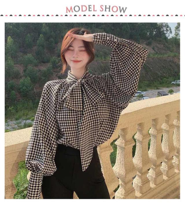 レディース リボン付き 千鳥柄 シャツ 長袖 ブラウス おしゃれ エレガント 通勤 上品 パフスリーブ ゆる感 女性らしい 千鳥柄 着痩せ 着回し力 普段着 トップス ボウタイブラウス デート 秋 冬 結婚式 入園式