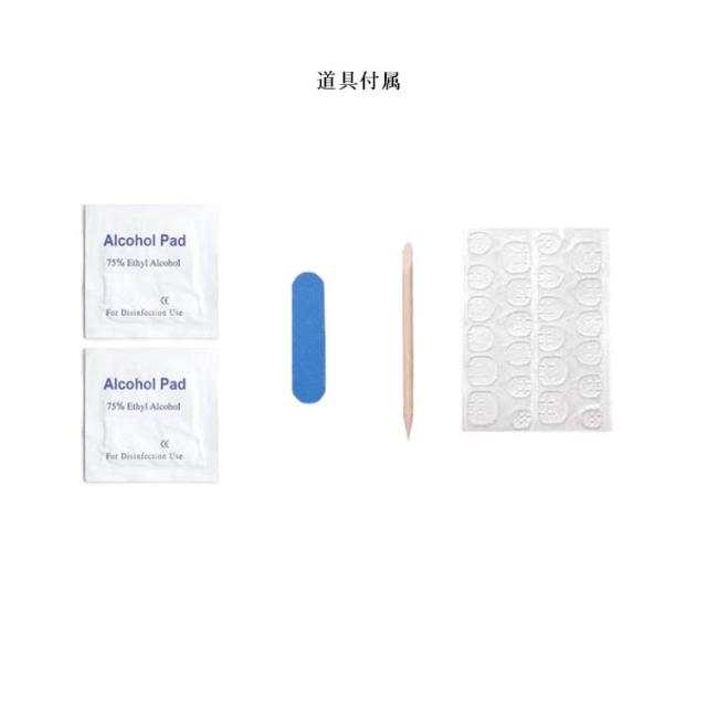 | サイズについての説明 | ※実寸はメジャー採寸の為、若干の誤差が生じる場合があります。 【ネイルチップの使い方】 〜取り付け方法〜 STEP1:付属のミニネイルファイルを使用して爪の表面を磨き、凹凸がない滑らかな状態にします。 STEP2:アルコール綿等で爪表面と手指を拭き取り、清潔で乾いた状態にしてください。 STEP3:粘着グミ全体のシートを開き、それぞれの爪のサイズに合う粘着を選びます。 粘着グミ上のシートつまみを持ち、グミを台紙から剥がして自爪の根元に合わせながら、真っすぐ置いて貼り付けていきます。 (※空気が入らないよう、指で空気を外に押し出すようにして隙間なくピッタリ貼り付けることが大切です。) STEP4:爪に貼った粘着上のつまみを持ってフィルムを剥がします。 ネイルチップの根元部分を、甘皮より1〜2mm上の位置に斜めに貼り、空気を抜きながら甘皮の方向へ押し込むようにして装着します。 STEP5:数秒間ネイルチップを指で抑えて、しっかり密着させます。(STEP4〜5を全ての爪に繰返し行ってください。) 〜取り外し方法〜 STEP1:ぬるま湯を用意し、1〜2分程度指を浸してください。 STEP2:付属のウッドスティックでネイルチップ先端を押して根本に隙間をつくり、ゆっくり剥がしていきます。 STEP3:剥がれにくい箇所がある場合、再度ぬるま湯に指を浸してから剥がしてください。 (※無理に剥がそうとすると、自爪が割れたり傷つく恐れがあるので、必ず慎重に行ってください。) STEP4:爪の表面に残った粘着グミは、付属のウッドスティックで絡めとるようにして取り除いてください。 |