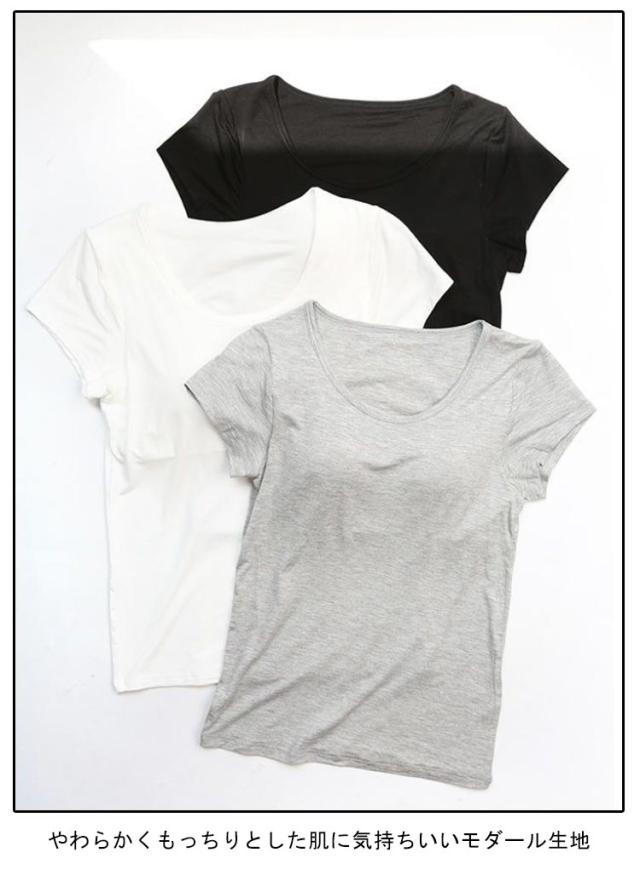 | 締め付けない カップ付きTシャツ やわらかくもっちりとした肌に気持ちいいモダール生地 ほどよく前面がフィットし、締め付け感なしでリラックスしたい休日などにぴったりです | |