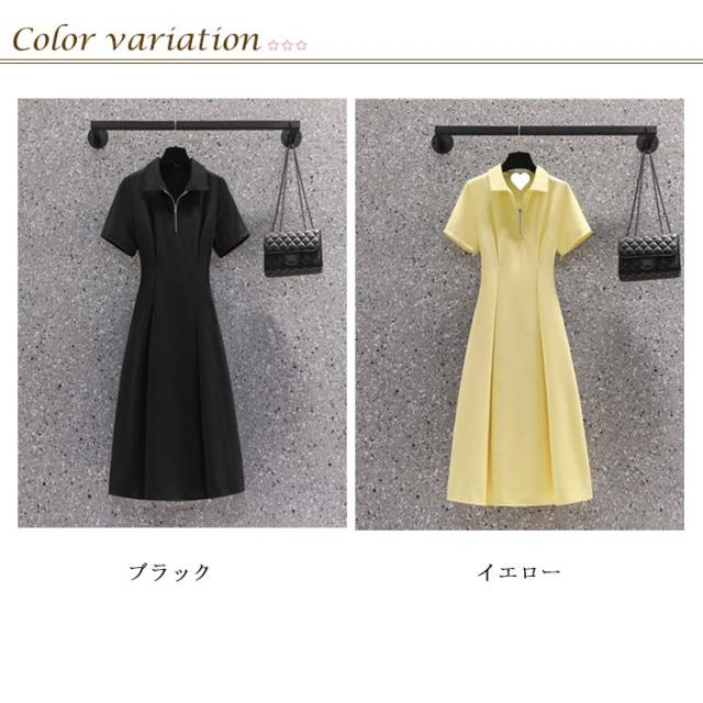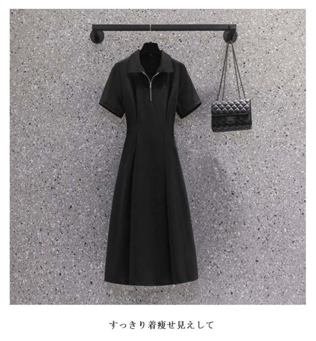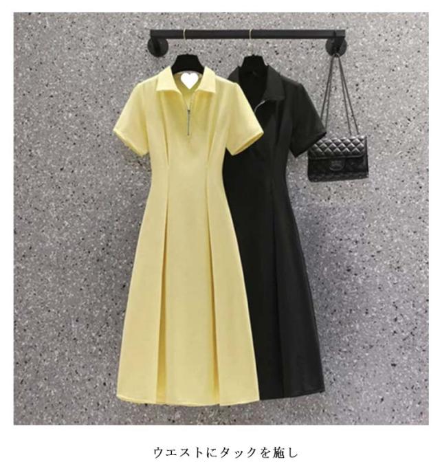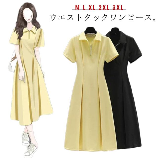 タック ワンピース ハーフジップ ウエスト ワンピース ロングワンピース レディース きれいめ ロング 半袖 ショートスリーブ ワンピース カジュアル ウエストタック Yネック 着痩せ 無地 春夏