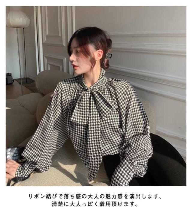 千鳥柄 シャツ ブラウス レディース トップス リボン付き 女性らしい 可愛い エレガント おしゃれ パフスリーブ 着痩せ 着回し力 ゆる感 長袖 上品 普段着 ボウタイブラウス 通勤 デート 秋 冬 結婚式 入園式