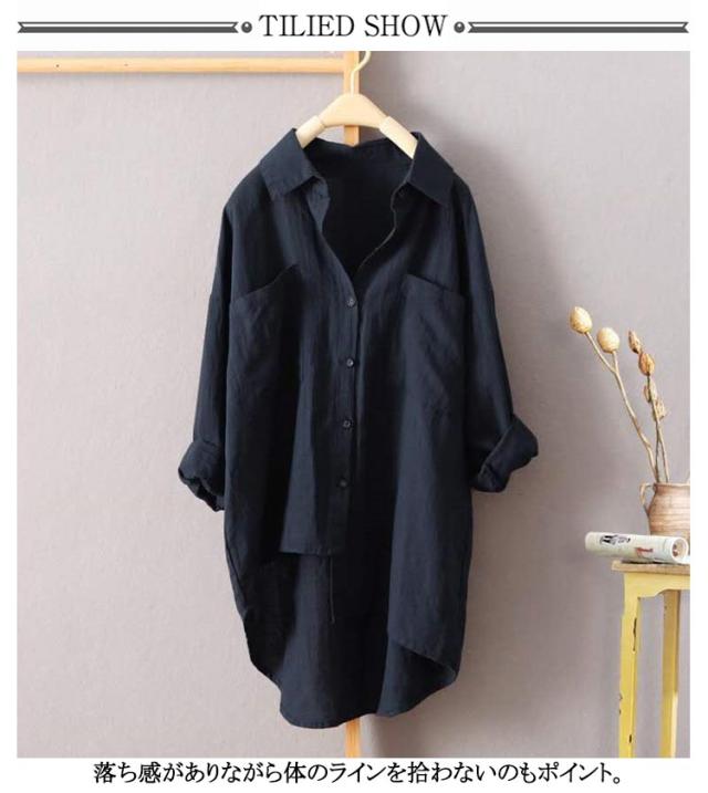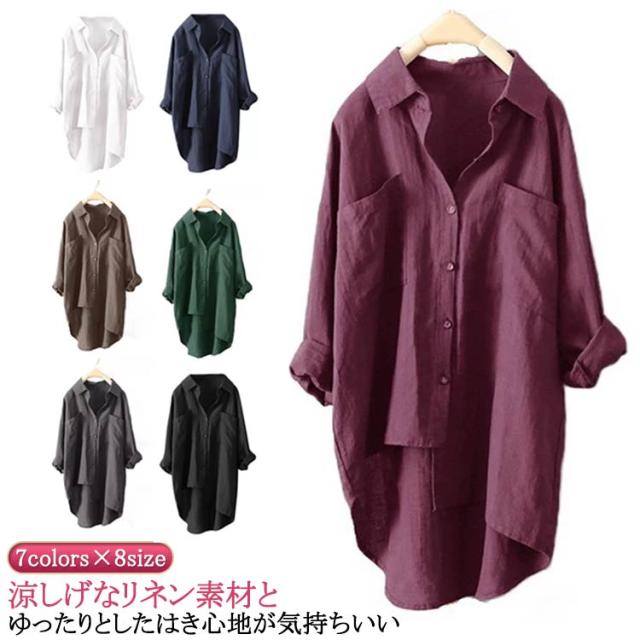 ブラック ホワイト トップス 麻 長袖シャツ ワイン リネン 前後差 ラウンド裾 無地 オーバーサイズ リネンシャツ 羽織り 送料無料 リネンシャツ ビッグシルエット グレー グリーン コーヒー ネイビー