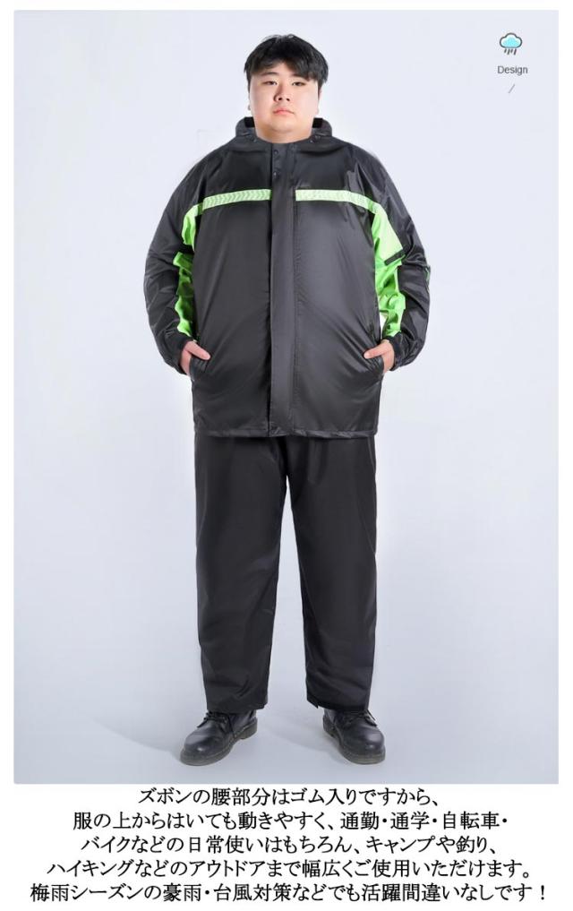 | 大きいサイズレインウェア上下セットです。 透明バイザー付きで視界良好。 前後とも安全反射テープ付き。 防水力高め、丈夫で破れにくいレインウェアです。 ズボンの腰部分はゴム入りですから、服の上からはいても動きやすく、通勤・通学・自転車・バイクなどの日常使いはもちろん、キャンプや釣り、ハイキングなどのアウトドアまで幅広くご使用いただけます。梅雨シーズンの豪雨・台風対策などでも活躍間違いなしです! | |