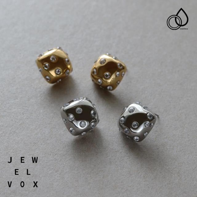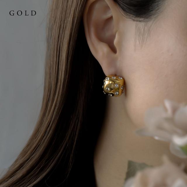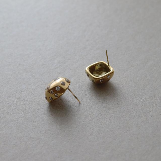ぷっくりとした丸みのあるスクエアフォルムに、大きさの異なるラインストーンをランダムに埋め込んだデザイン。