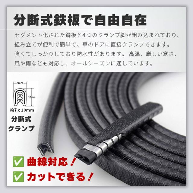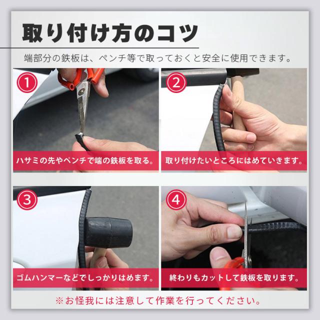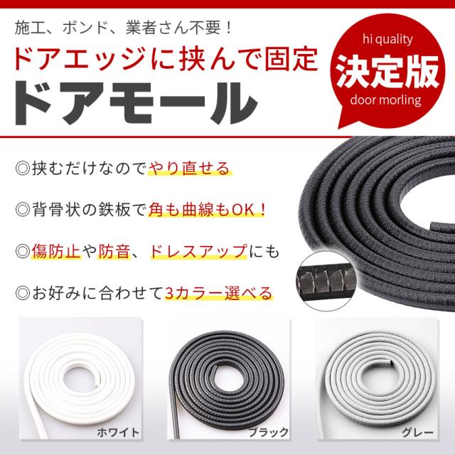 車のエッジの傷防止に!挟み込むだけの簡単モール【糊も両面もいらない特殊設計】内蔵された特殊な鉄のパーツとラバーの形状により、両面テープなど使わず挟み込むだけで取り付けできます。糊後を気にせず、また、やり直しも簡単にできます。【傷防止・防音・ドレスアップ】傷つきやすいエッジを、縁石、駐車場などでの他車、壁などから守ってくれます。また、防音、ドレスアップとしても使用されています。(※角度、強さ等で傷がつく場合もございます。)【選べる3カラー】ブラック、グレー、ホワイトの3カラーよりお好きなものを選択できます。