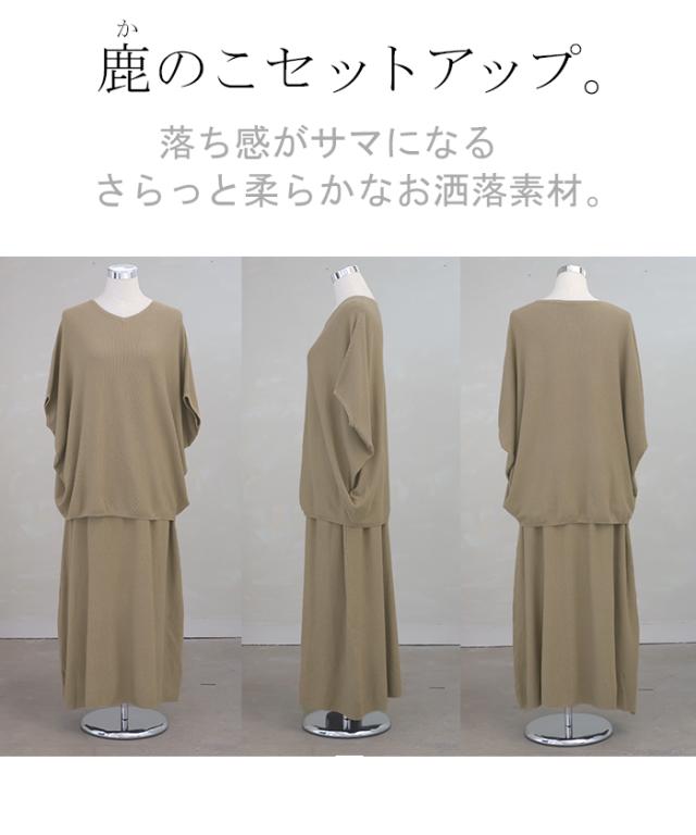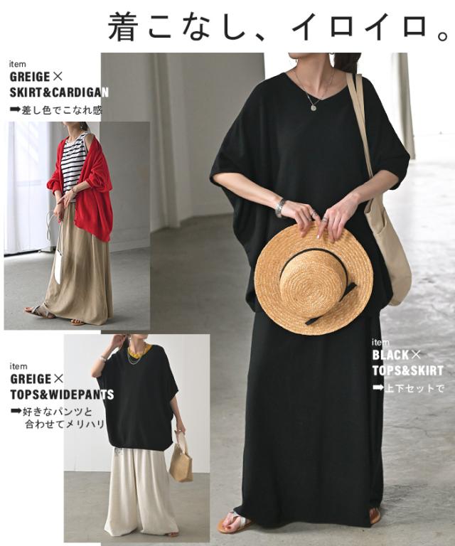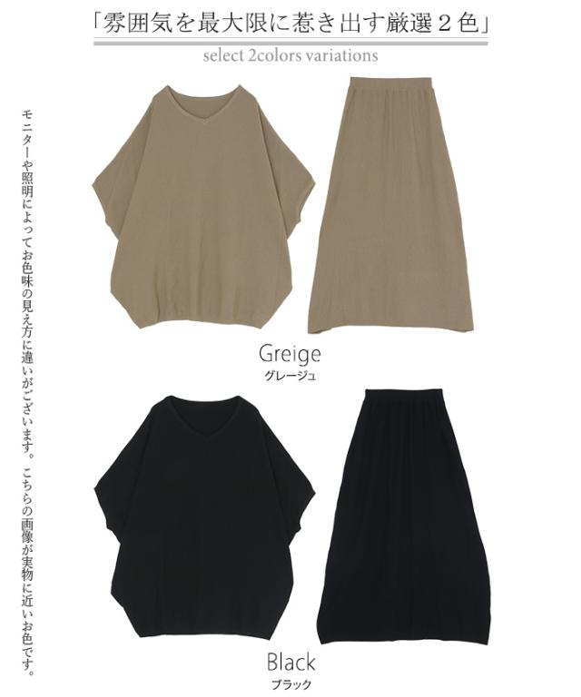 2点セット『 ニットT × スカート 』 鹿のこ チクチクしない 鹿の子 ニット Tシャツ セットアップ トップス チュニック 半袖 Vネック ニットスカート ロング ロングスカート Aライン レディース 体型カバー きれいめ 黒 グレージュ 春 夏 HUG.U 秋新作
