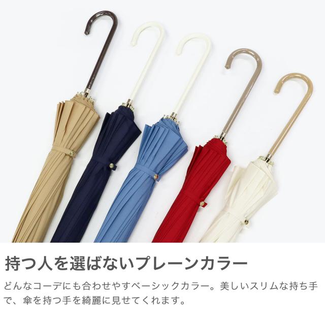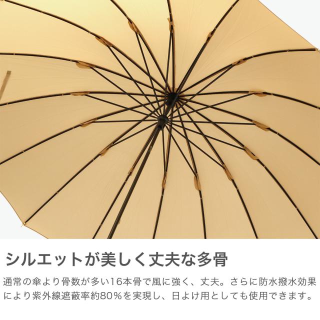 人気の16フレームからプレーンカラーが登場。カジュアルにもフォーマルにもマッチする、シンプルな晴雨兼用長傘です。本体は16本骨の骨組みで、手動で開くタイプのモデル。しっかりとした安定感があり、ベーシックカラーでどんなコーデにも合わせやすいデザインとなっています。