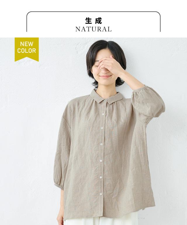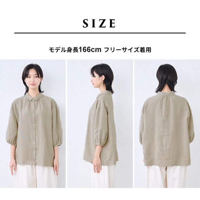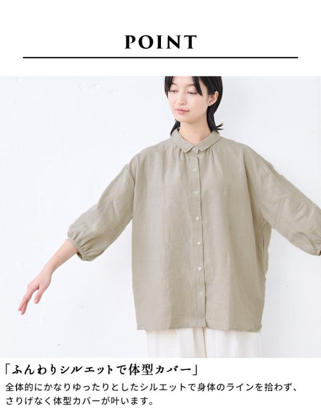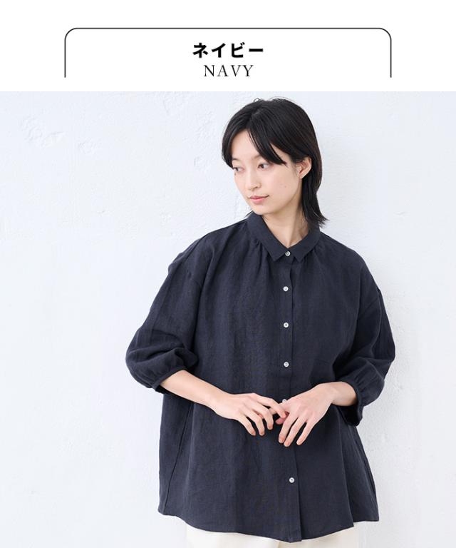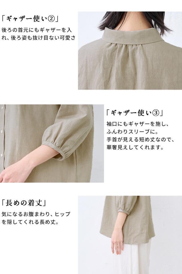 40番手 フレンチリネン100% ギャザー使い シャツ 日本製 / リネン シャツ 七分袖 レディース ブラウス 40代 50代 60代 30代 女性 ファッション 7 分 袖 七分袖 麻 速乾 抗菌 麻100% 無地 襟付き 体型カバー 日除け 紫外線対策 日よけシャツ 羽織り
