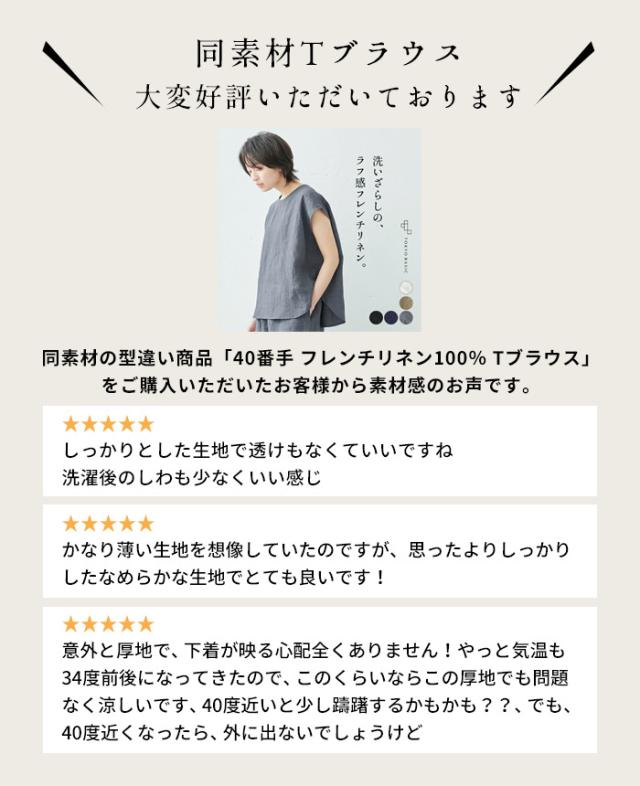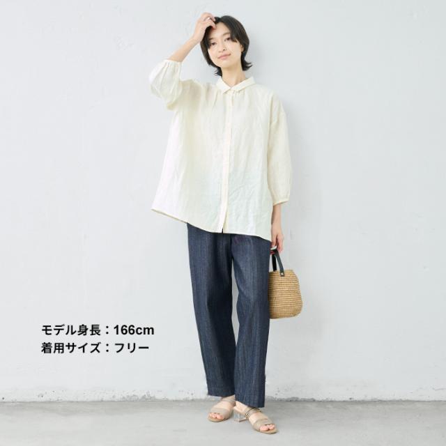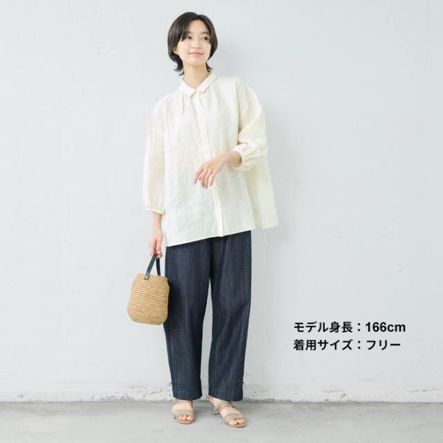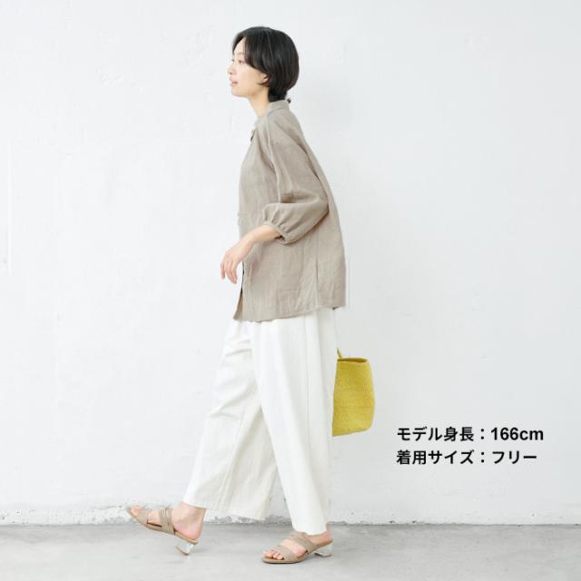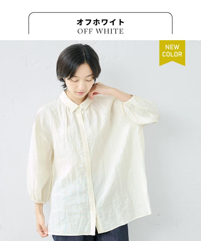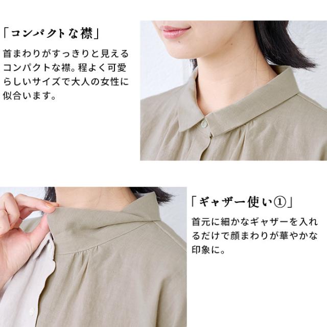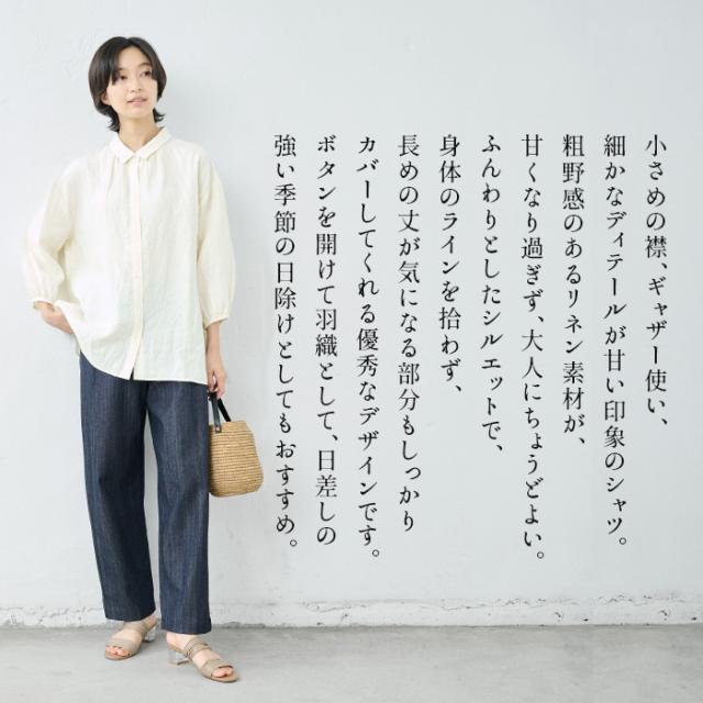 特徴 ふわりリネン、大人の甘めシャツ。細かなギャザー使いが、ほんのり甘めの大人シャツ。小さめの襟、ギャザー使い、細かなディテールが甘い印象のシャツ。粗野感のあるリネン素材が、甘くなり過ぎず、大人にちょうどよい。ふんわりとしたシルエットで、身体のラインを拾わず、長めの丈が気になる部分もしっかりカバーしてくれる優秀なデザインです。ボタンを開けて羽織として、日差しの強い季節の日除けとしてもおすすめ。