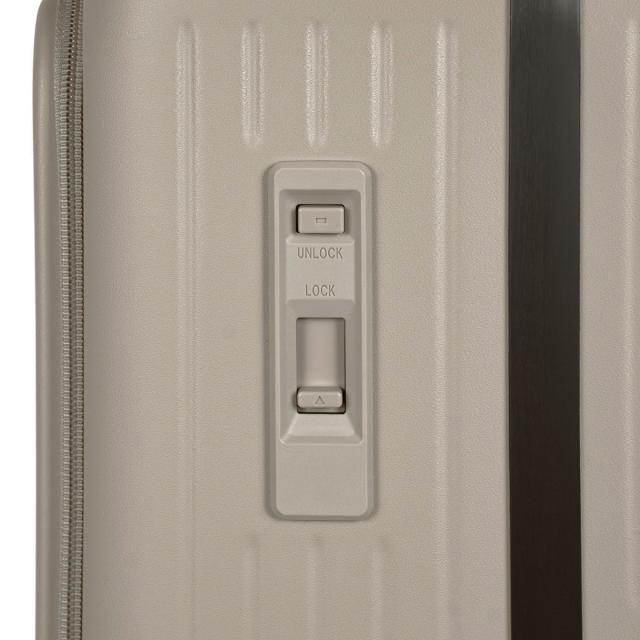 指1本で操作できる、ワンタッチのキャスターストッパーを搭載。スライドスイッチでロック、ボタンプッシュでリリースです。電車内や空港のスロープでも安心です。