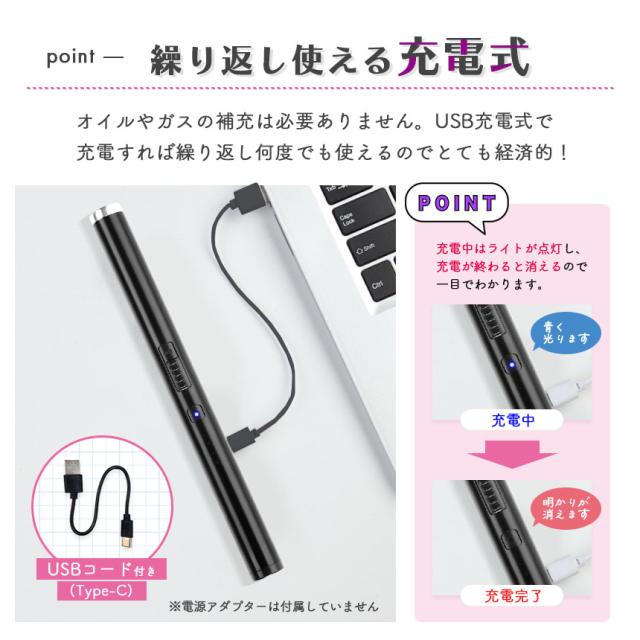 ガス・オイルの交換不要、風に強い、安全なライターがあります。