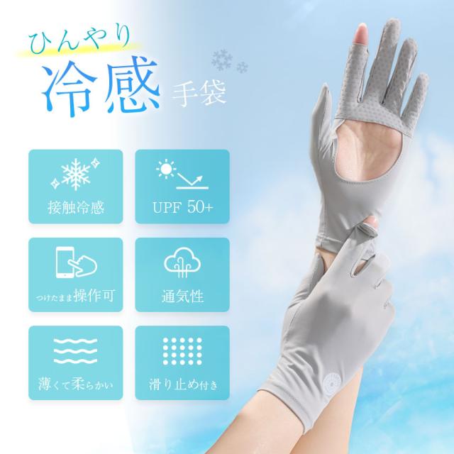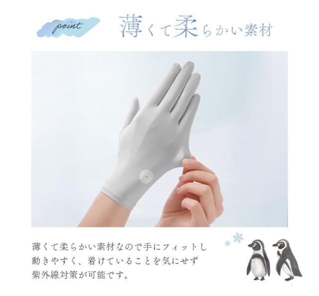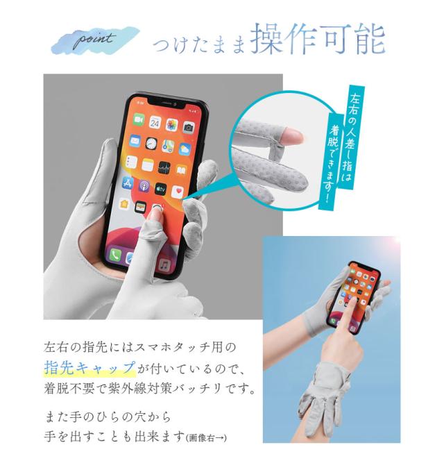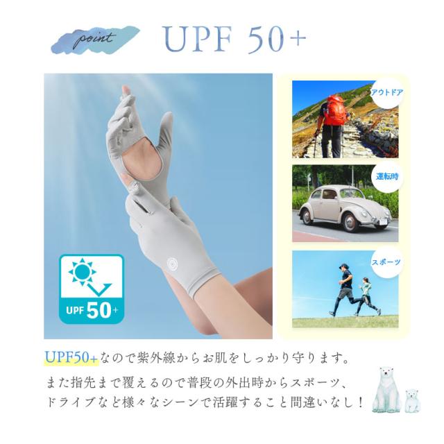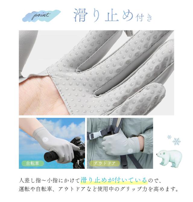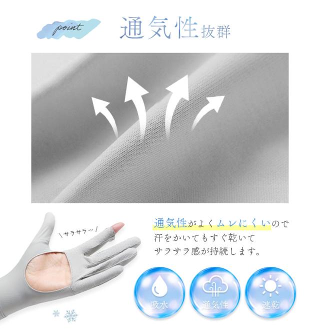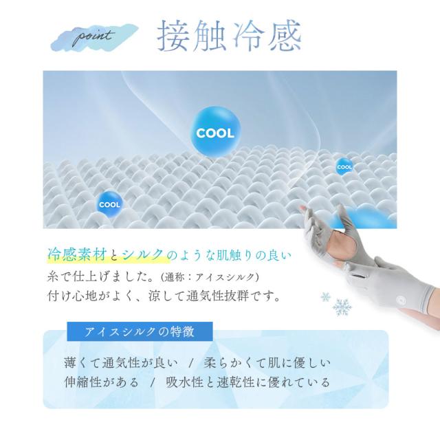 ●接触冷感手袋 UPF50+●【接触冷感】冷感素材とシルクのような肌触りの良い糸で仕上げました。(通称:アイスシルク)付け心地がよく、涼して通気性抜群です。*アイスシルクの特徴*薄くて通気性が良い / 柔らかくて肌に優しい伸縮性がある / 吸水性と速乾性に優れている