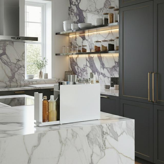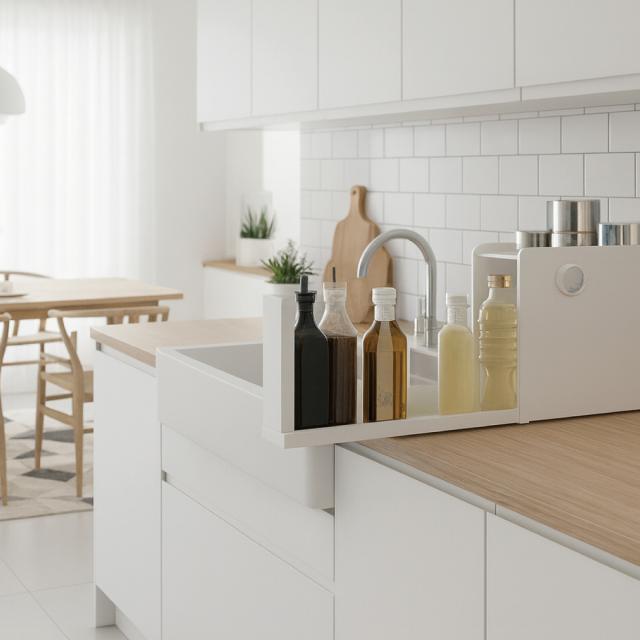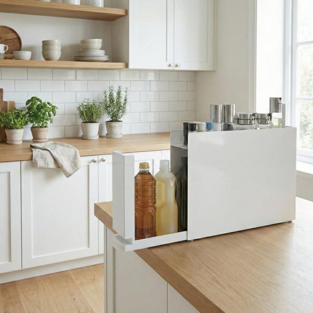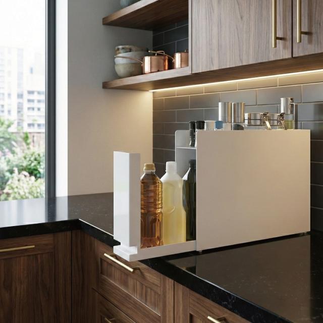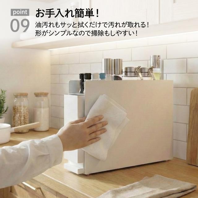 【調味料を汚れから守る】下段に収納された調味料は汚れがつかないのはもちろん、上段に収納された物も立ち上がりがあるので汚れにくい!