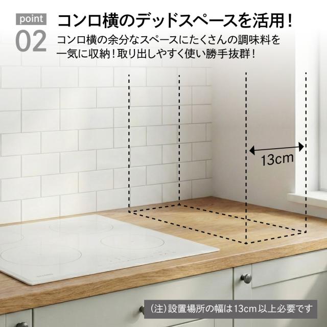【上段・下段の両方に物を置ける】上段には塩、コショウなどの小さな物を、下段には油などの大きな物を収納可能!