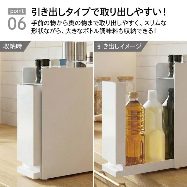【引き出しタイプで取出しやすい】手前のものから奥の物まで取り出しやすく、スリムな形状ながら、大きなボトル調味料も収納できる!
