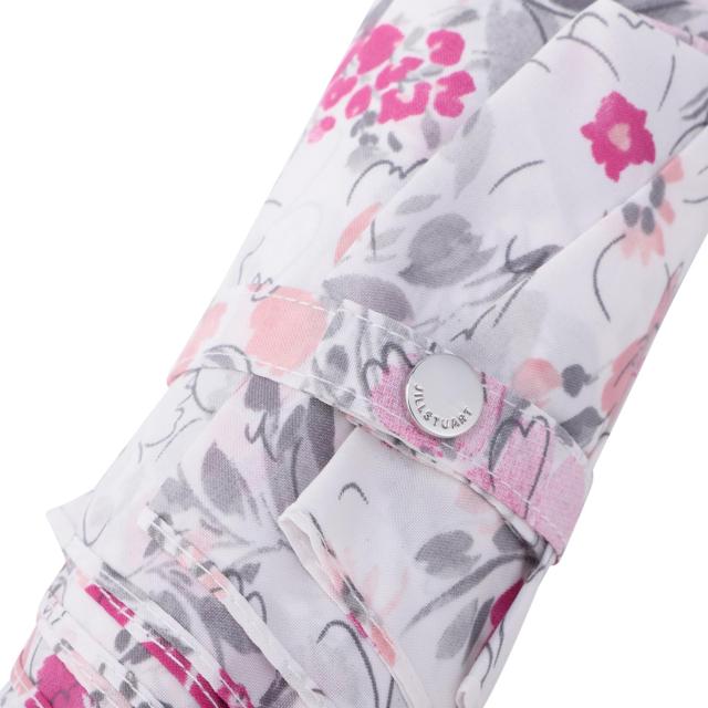 ジル スチュアートの折りたたみ傘です。華やかで上品な色合いの花柄プリントが魅力のデザインです。ジル スチュアートのロゴ入り留め具がエレガントさを引き立てます。ネイルや指に優しいハジキカバー付きになります。1年を通して活躍してくれるため、1本持っておくといざというときに便利です。コーディネートに合わせやすいデザインはプレゼントにもおすすめです。
