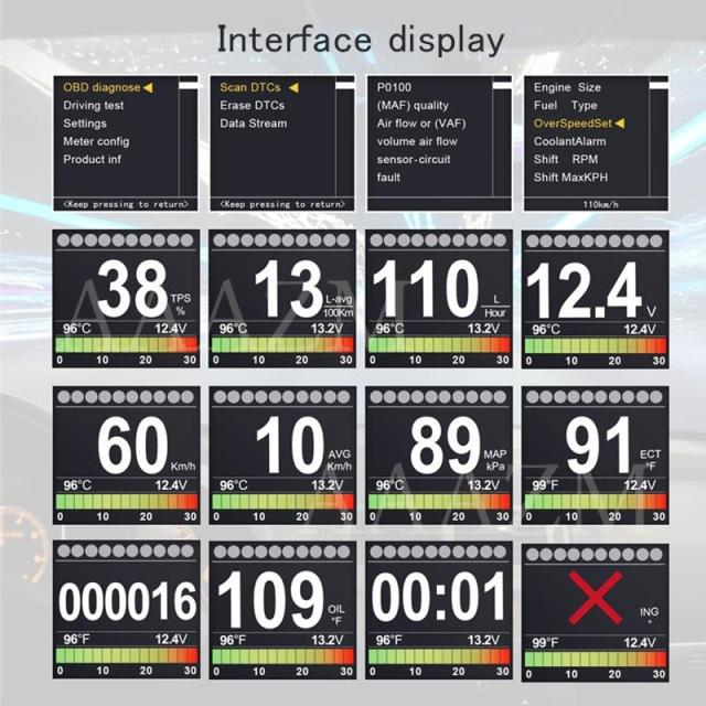 そして、バッテリ電圧、エンジン充電電圧、過速度アラーム、エンジン温度警告も監視します。 水温警告、オーバースピードアラーム、シフト通知、車両の誤動作警告などをサポートし、安全運転を確保します。
