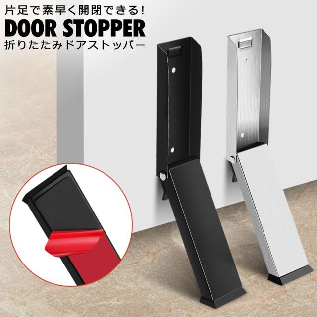 耐久性に優れたステンレス素材を使用したこのドアストッパーは、折りたたみ式で収納も簡単。両面テープやネジでの取り付けが可能で、手を使わずに片足で簡単に開閉できる便利な設計です。