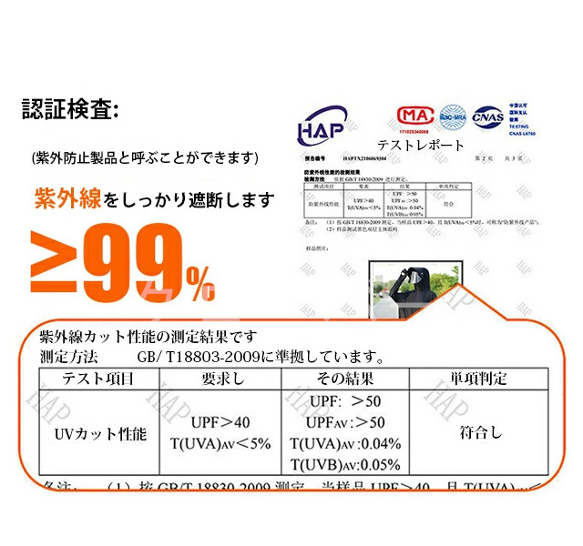 ★最高等級のUPF50+。肌の奥まで届く紫外線A波(UVA)、肌を赤くする紫外線B波(UVB)を防ぎます。UPF(Ultraviolet Protection Factor)とは、紫外線対策先進国のオーストラリアやアメリカなどで一般的に使われている紫外線防止指数です。さらに50回洗っても紫外線カット率は99%!