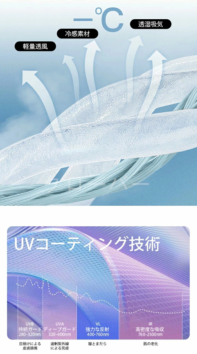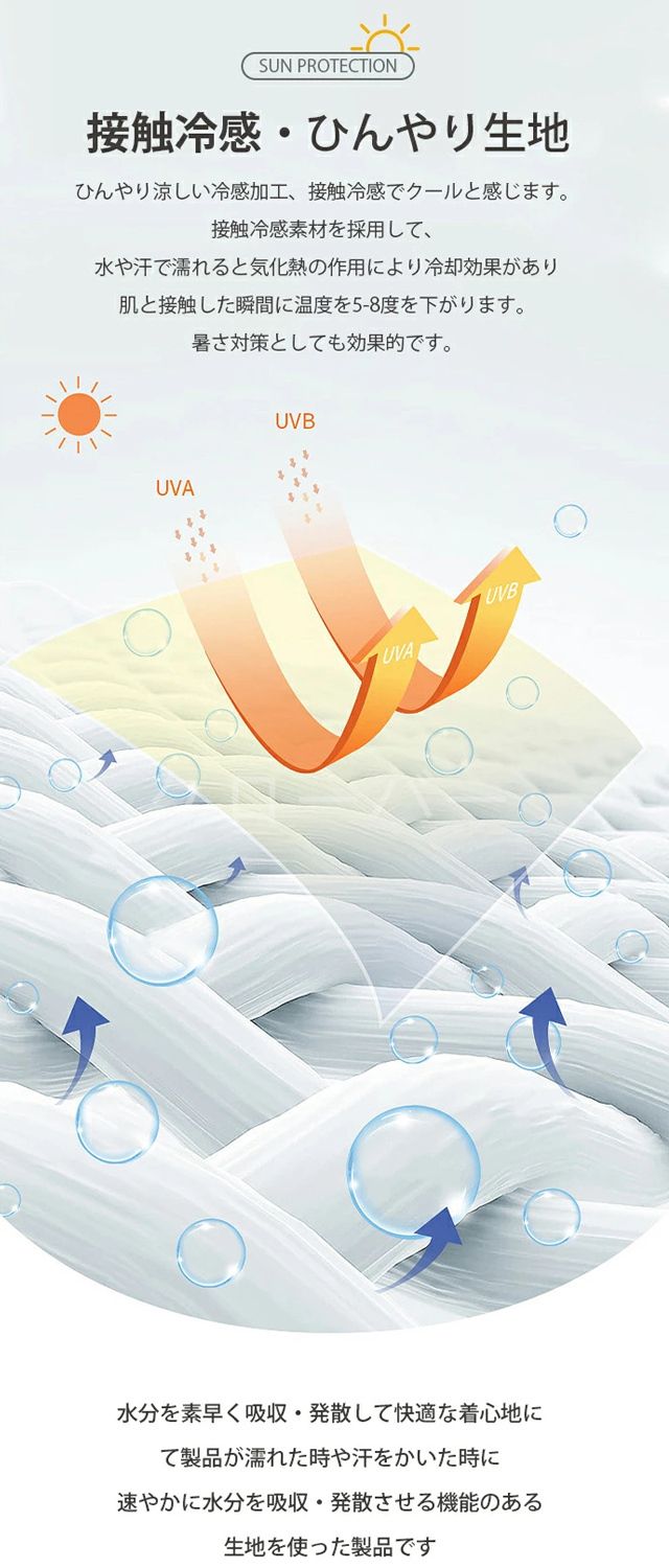 ★熱伝導率・拡散率が高い繊維のため、肌に触れると熱を素早く吸収・拡散してくれます。 ひんやりと冷たくシャリ感のある生地が汗ばむ季節でも快適に。ご着用頂いて、体感は-5度になります。夏で日焼けやケガからサーファーを保護するアイテムとして愛用されてきたuvパーカー。