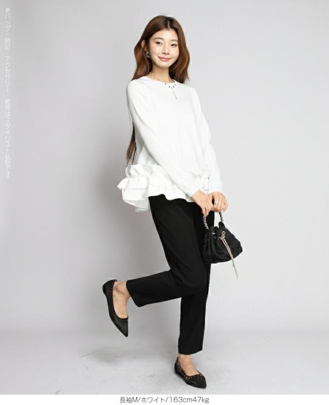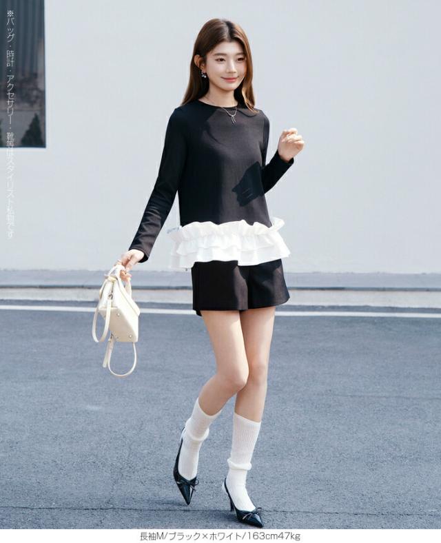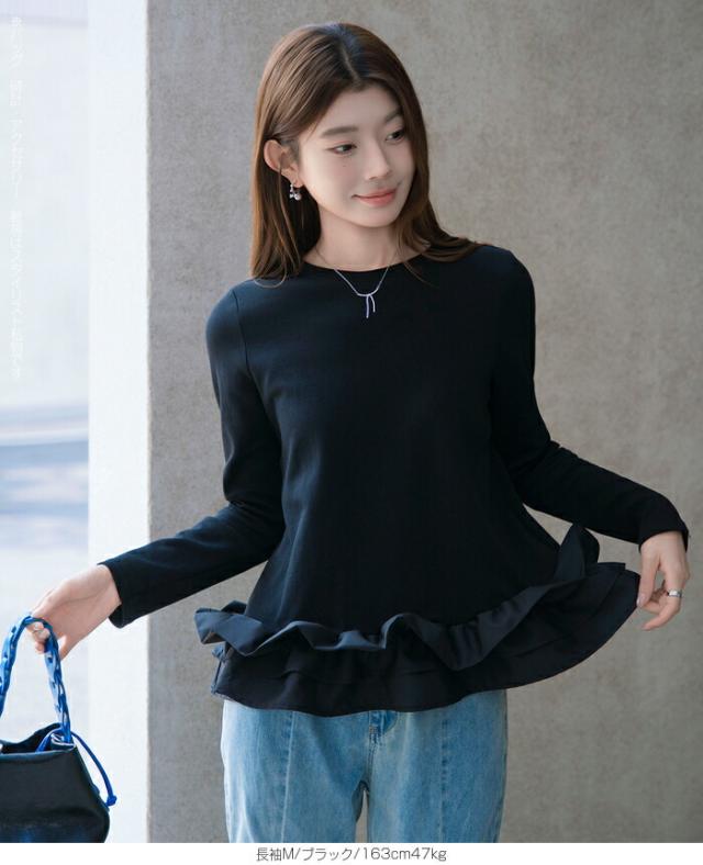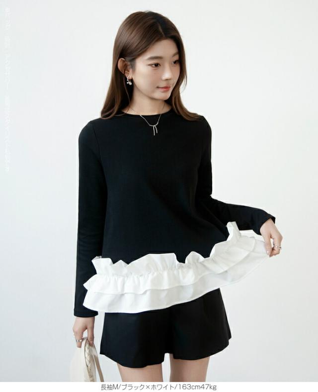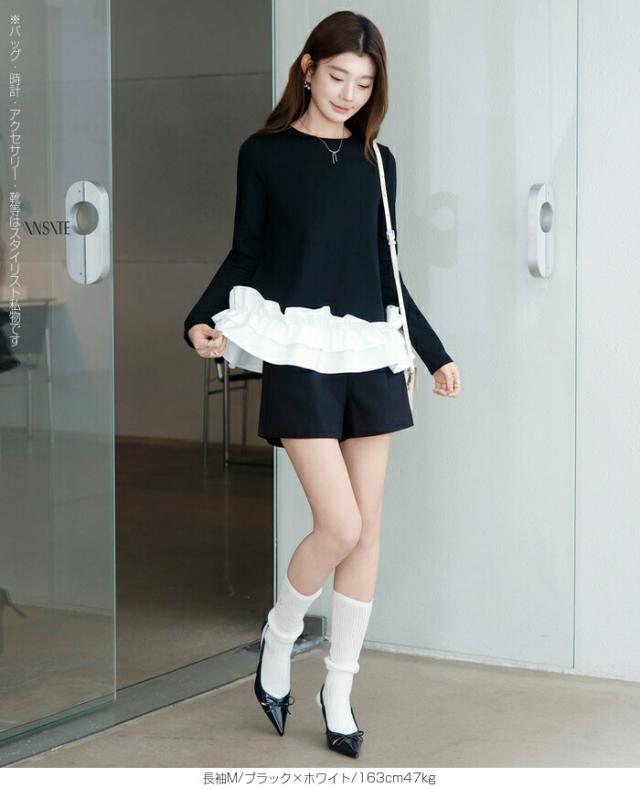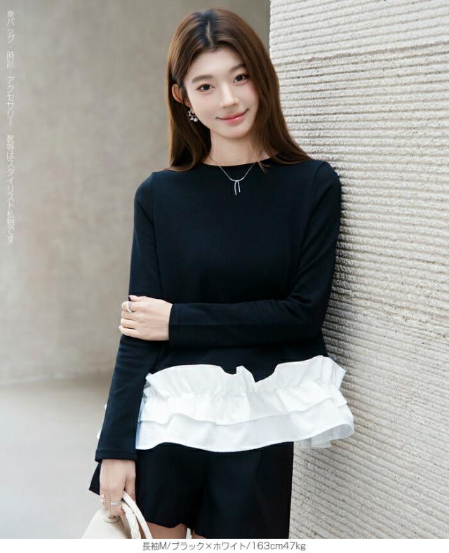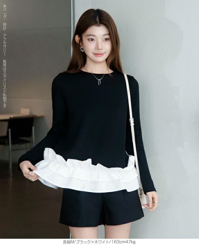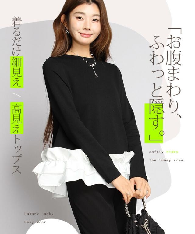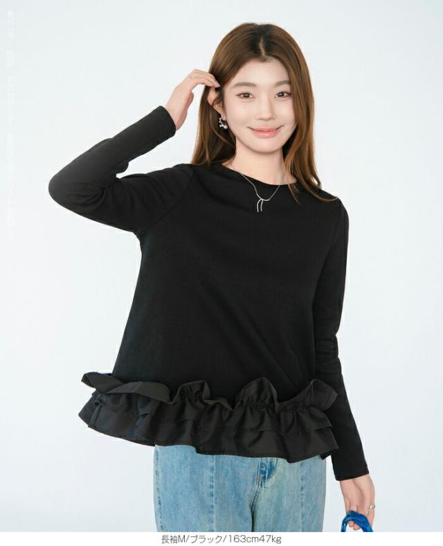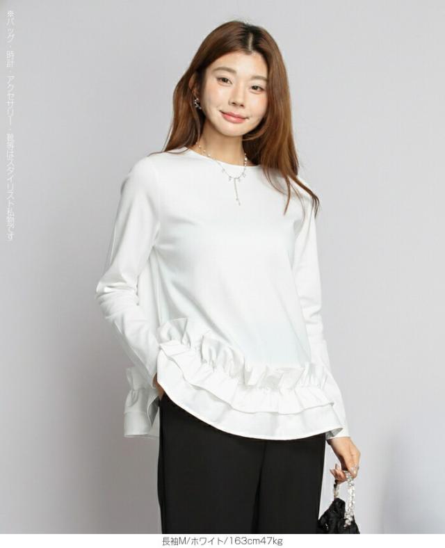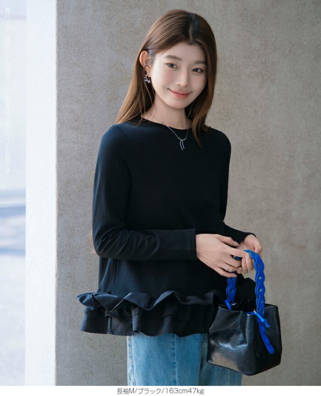 | 「可愛い」は欲しい。 でも、やりすぎは違う。 そんな大人女性にちょうどいい、 甘さを裾だけに効かせた上品フリルトップス。 身頃はシンプルな長袖カットソー。 そこに異素材の立体フリルをドッキング。 甘さを限定することで、 子どもっぽくならない 着るだけで華やぐ 体型カバーも同時に叶う カットソーのラクさと、ブラウス見えするきちんと感。 普段使いにちょうどいい“高見えトップス”です。 【素材感・着心地】 身頃はなめらかなスムースコットン素材。 程よい厚みで透けにくく、柔らかな肌あたり。 裾フリル部分は軽やかな布帛素材。 ハリ感があり、ペプラム風シルエットをキープ。 カジュアルすぎない“高見え質感”が魅力。 【シルエット・サイズ感】 すっきりIライン設計 裾に向かってふわっと広がるペプラム風 ヒップにかかる安心丈 お腹・腰回りを自然にカバー。 広がりすぎない設計で上品見え。 サイズはM/L展開。 普段サイズでOK。 ゆとりはありつつ、着ぶくれしにくいバランスです。 【着回し&コーデ提案】 ● デニム合わせ → 甘辛バランスの大人カジュアル ● テーパードパンツ合わせ → きれいめ通勤コーデにも対応 ● ワイドパンツ合わせ → 今っぽリラックススタイル 1枚で着映え。 重ね着不要でコーデ完成。 |