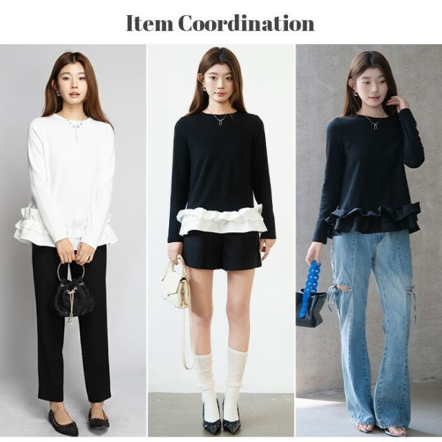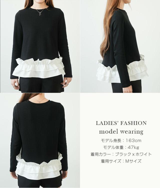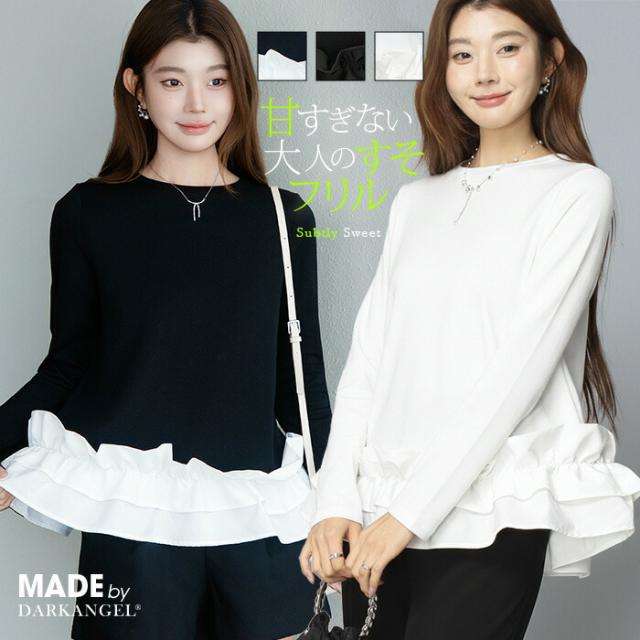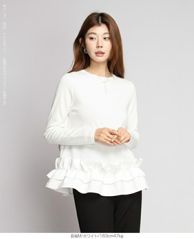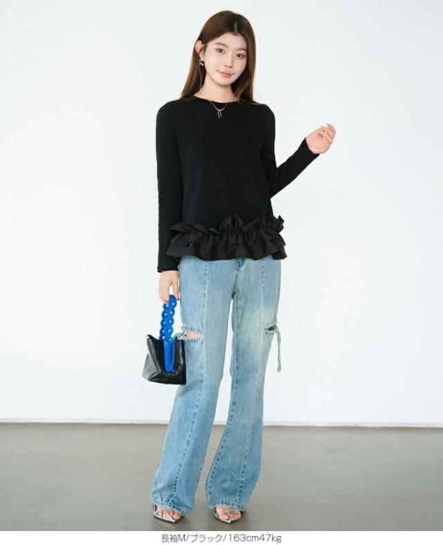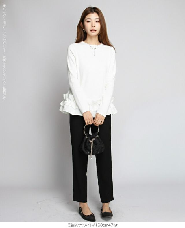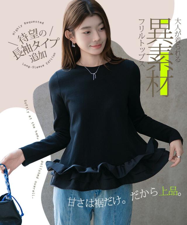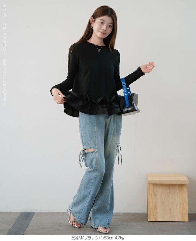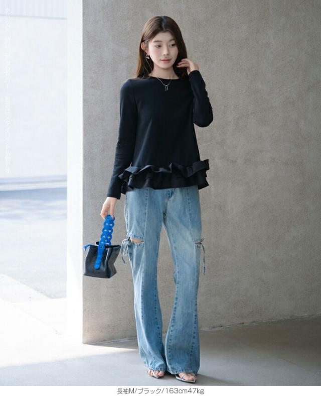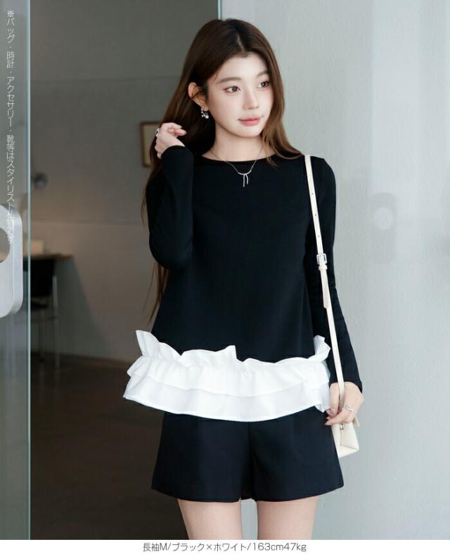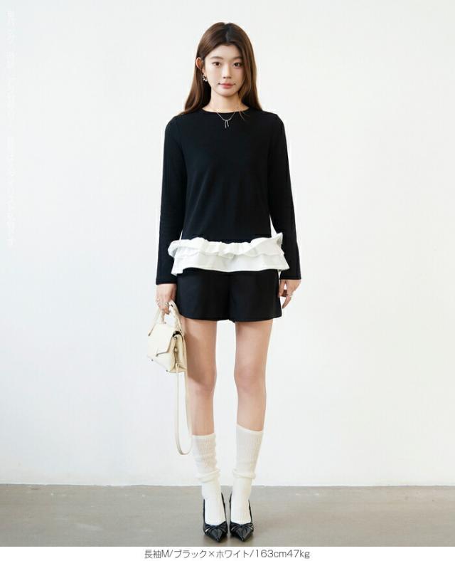 | 「可愛い」は欲しい。 でも、やりすぎは違う。 そんな大人女性にちょうどいい、 甘さを裾だけに効かせた上品フリルトップス。 身頃はシンプルな長袖カットソー。 そこに異素材の立体フリルをドッキング。 甘さを限定することで、 子どもっぽくならない 着るだけで華やぐ 体型カバーも同時に叶う カットソーのラクさと、ブラウス見えするきちんと感。 普段使いにちょうどいい“高見えトップス”です。 【素材感・着心地】 身頃はなめらかなスムースコットン素材。 程よい厚みで透けにくく、柔らかな肌あたり。 裾フリル部分は軽やかな布帛素材。 ハリ感があり、ペプラム風シルエットをキープ。 カジュアルすぎない“高見え質感”が魅力。 【シルエット・サイズ感】 すっきりIライン設計 裾に向かってふわっと広がるペプラム風 ヒップにかかる安心丈 お腹・腰回りを自然にカバー。 広がりすぎない設計で上品見え。 サイズはM/L展開。 普段サイズでOK。 ゆとりはありつつ、着ぶくれしにくいバランスです。 【着回し&コーデ提案】 ● デニム合わせ → 甘辛バランスの大人カジュアル ● テーパードパンツ合わせ → きれいめ通勤コーデにも対応 ● ワイドパンツ合わせ → 今っぽリラックススタイル 1枚で着映え。 重ね着不要でコーデ完成。 |
