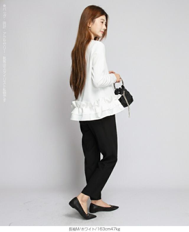 裾に大胆なフリルを施したペプラム見えデザインで、