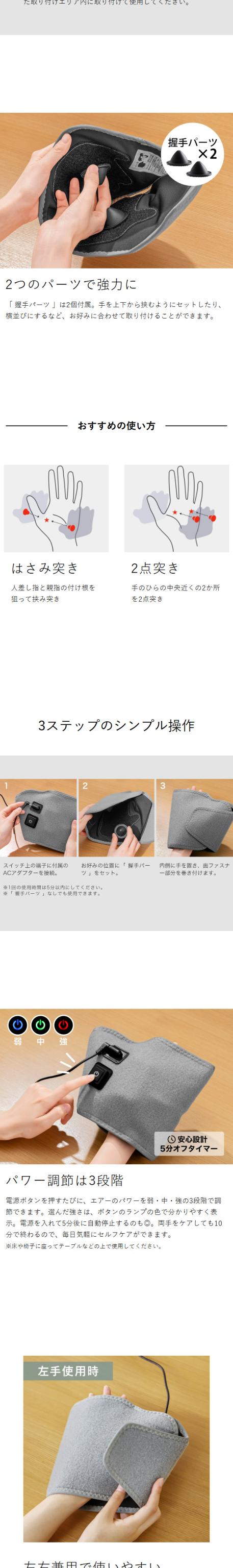 強力な押しがやみつきに 自宅で手軽にハンドケア 『 ゴリラの握手 』は、コンパクトながら絶妙な強さで、片方ずつ手を包んでリフレッシュさせてくれる電動ハンドケアアイテム。内蔵された強力ポンプ&エアバッグと、2か所に取り付けられるダブル握手パーツによって、まるでゴリラと握手しているようなハイパワーを実現。付属の電源ケーブルをつなぎ、ボタンを押すだけのシンプル操作で、パワーは弱・中・強の3段階で調節できます。大きな面ファスナーで装着も簡単。電源を入れて5分後に自動停止する安全設計も◎です。