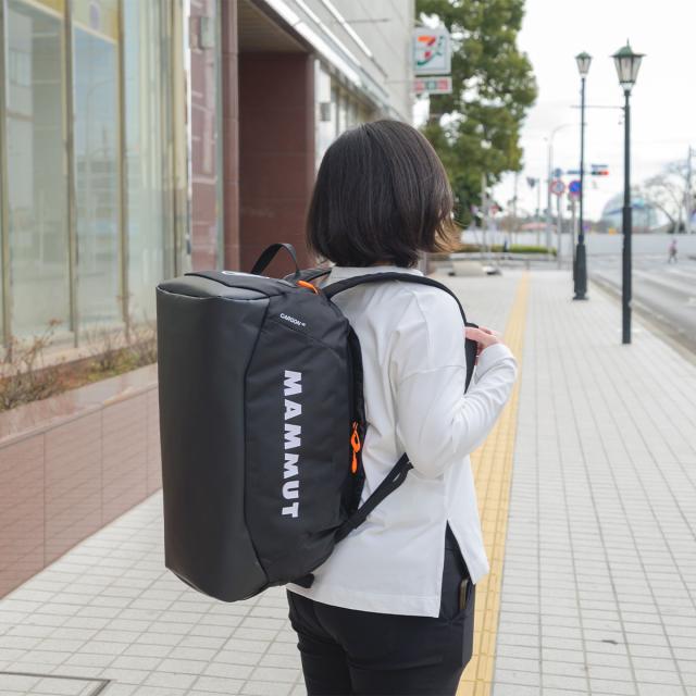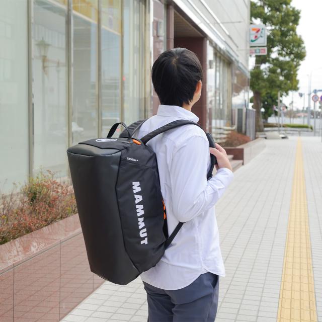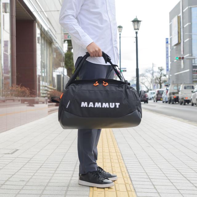 マムートのリュックボストンバッグ。荷物が大きくなるスポーツからキャンプなどのアウトドア、旅行まであらゆるシーンで活躍します。ショルダーストラップで背負う、キャリーハンドルで持って活用できる2WAY仕様になっています。