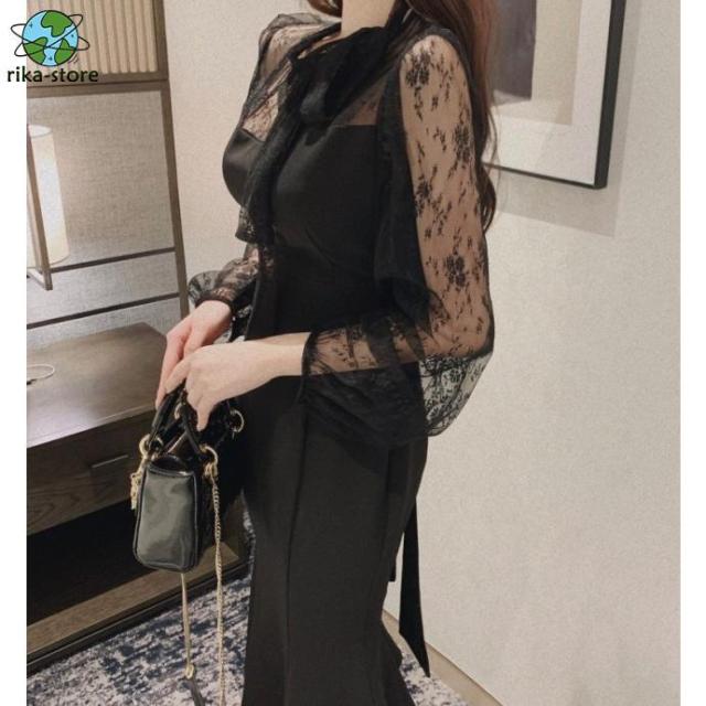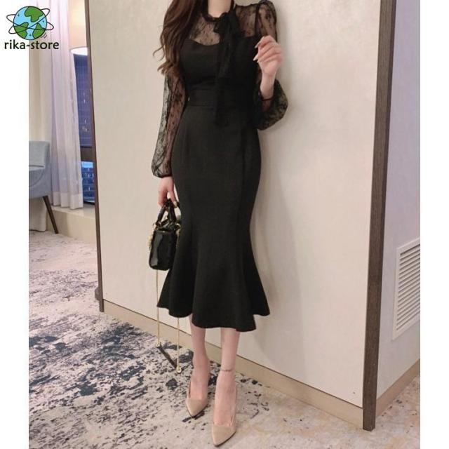 パーティードレス 結婚式 お呼ばれドレス マーメイドワンピース マーメイドドレス シアー袖 ボウタイリボン パフスリーブ 袖あり 長袖 黒 膝下丈