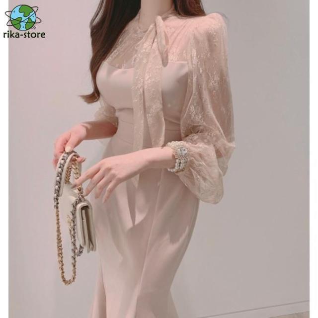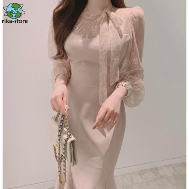 パーティードレス 結婚式 服装 女性 お呼ばれドレス マーメイドワンピース マーメイドドレス シアー袖 ボウタイリボン パフスリーブ 袖あり 長袖 膝下丈 シースルー フォーマル 袖ありドレス ウエストマーク ミモレ丈 ミディアムドレス ミディアムワンピース 二次会 黒 韓国 スマートカジュアル 20代 30代 40代 ピンク ブラック