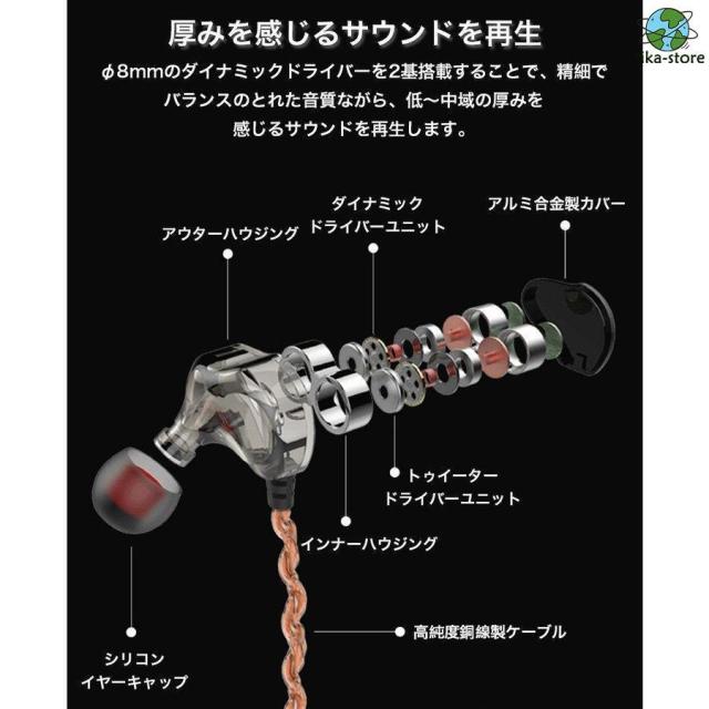φ8mmのダイナミックドライバーを2基搭載することで、精細でバランスのとれた音質ながら、低?中域の厚みを感じるサウンドを再生します。
