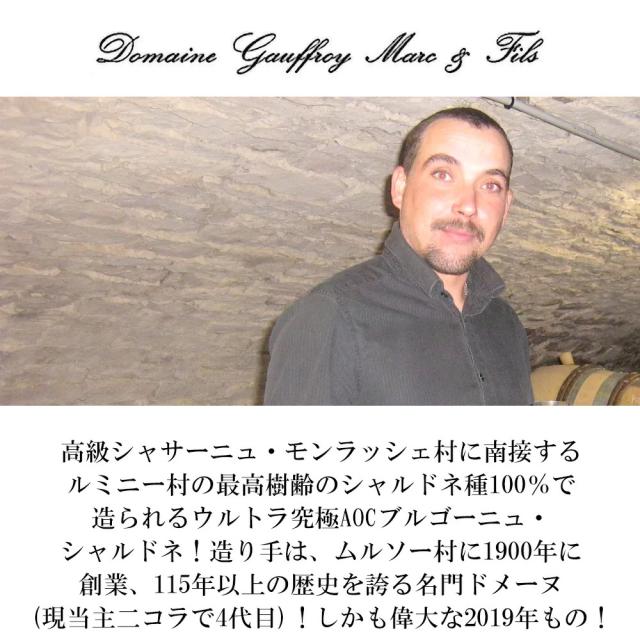 高級シャサーニュ・モンラッシェ村に南接するルミニー村の最高樹齢のシャルドネ種100%で造られるウルトラ究極AOCブルゴーニュ・シャルドネ!造り手は、ムルソー村に1900年に創業、115年以上の歴史を誇る名門ドメーヌ (現当主二コラで4代目) !しかも偉大な2019年もの!
