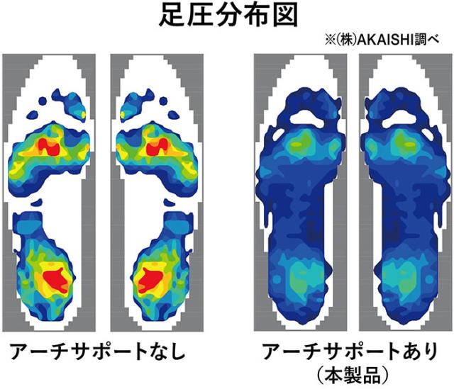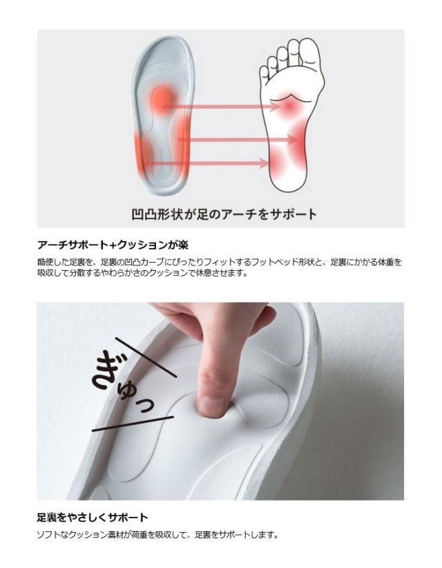 アーチのサポート+クッションで、足裏にかかる体重を吸収し分散させることで、酷使した足裏をやさしくサポート。