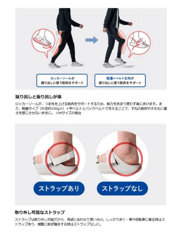 ロッカーソールと甲ベルト+ヒールストラップで足の筋力をあまり使わずに楽な歩行に。