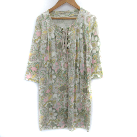 【中古】エリオポール ワンピース ひざ丈 七分袖 総柄 レースアップ 36 S マルチカラー アイボリー 緑 グリーン