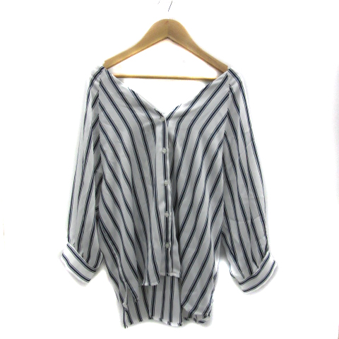 【中古】ビッキー VICKY シャツ ブラウス 七分袖 Vネック ストライプ柄 2 白 ホワイト 紺 ネイビー レディース