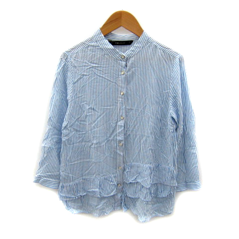 【中古】ザラ ベーシック シャツ ブラウス 七分袖 バンドカラー ストライプ柄 XS 水色 ライトブルー 白 レディース