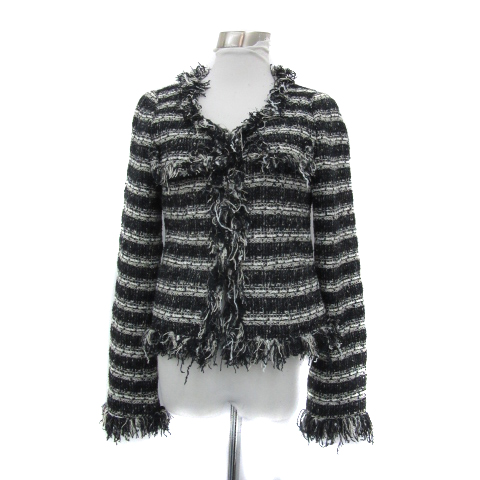 【中古】ブラック バイ マウジー ノーカラージャケット ミドル丈 ボーダー柄 ツイード フリンジ 2 黒 白 レディース