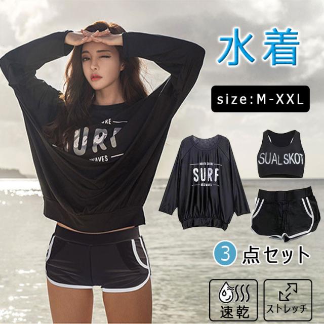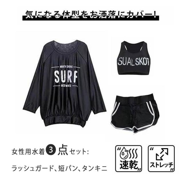 タンキニ 水着 レディース 体型カバー 速乾 長袖 半袖ラッシュガード付き 3点セット ビキニ セパレート 洋服みたいな水着 ハーフパンツ UPF50+ UVカット 無地 黒 かわいい 露出控えめ 大人 ママ水着 20代 30代 40代 50代 大きいサイズ プール