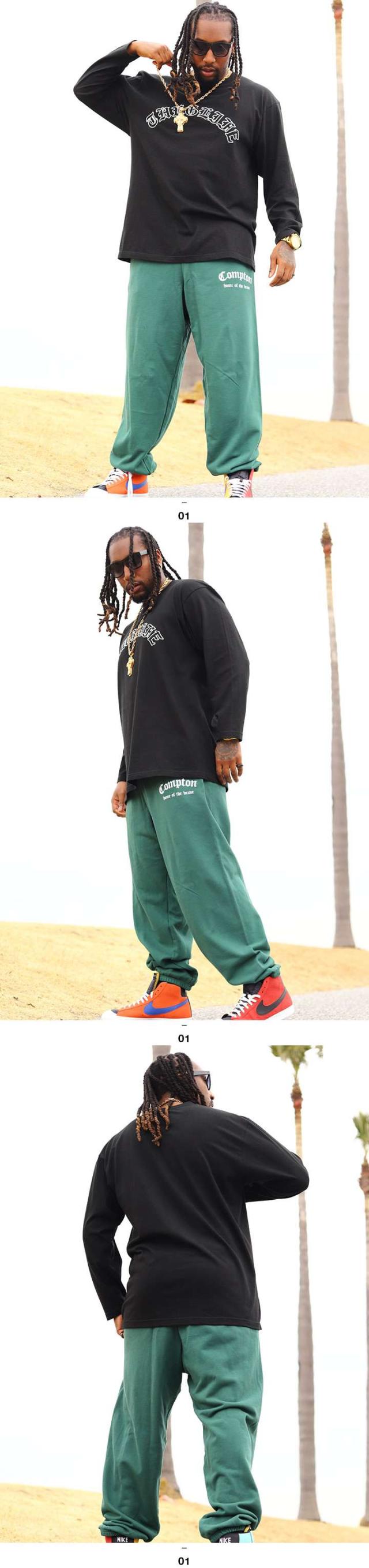 ロンTにウエッサイを代表する伝説的ラップ・アーティストの『スラング』、スウェットロングパンツに『Compton』をドロップした上下セット。