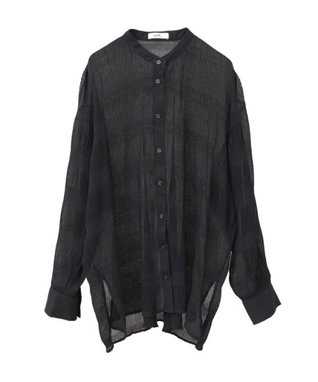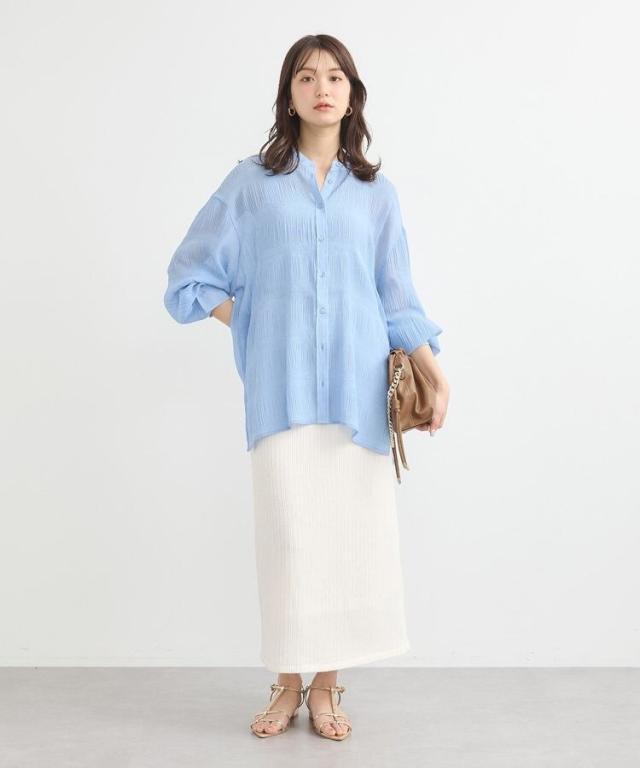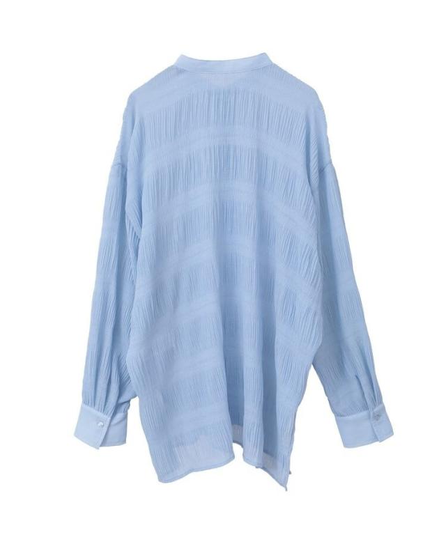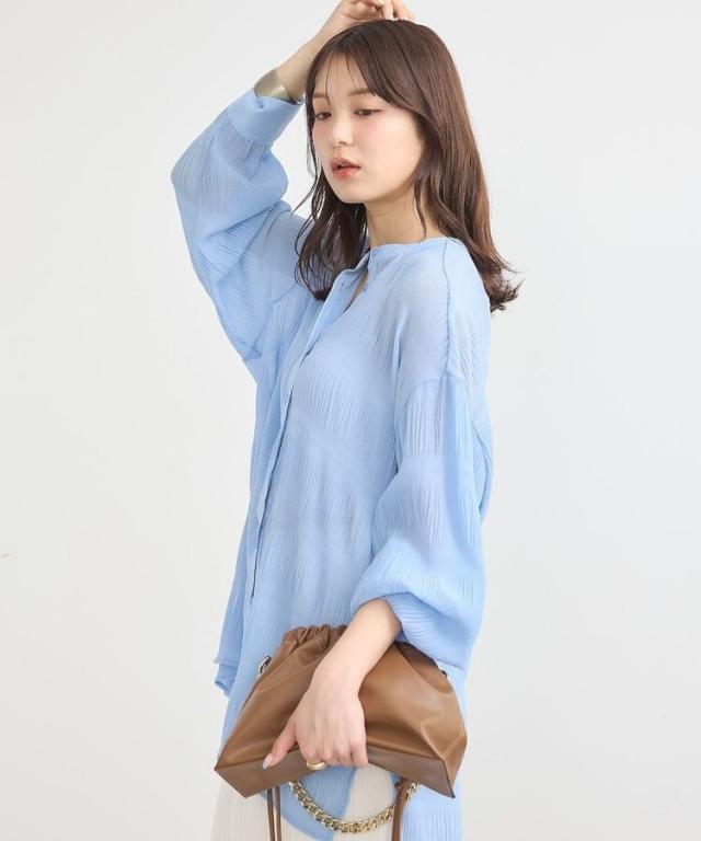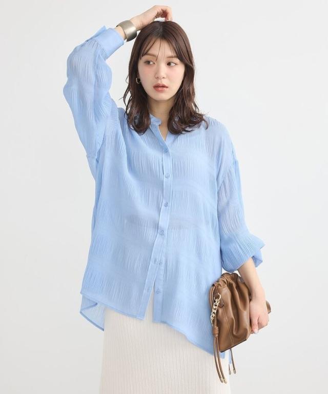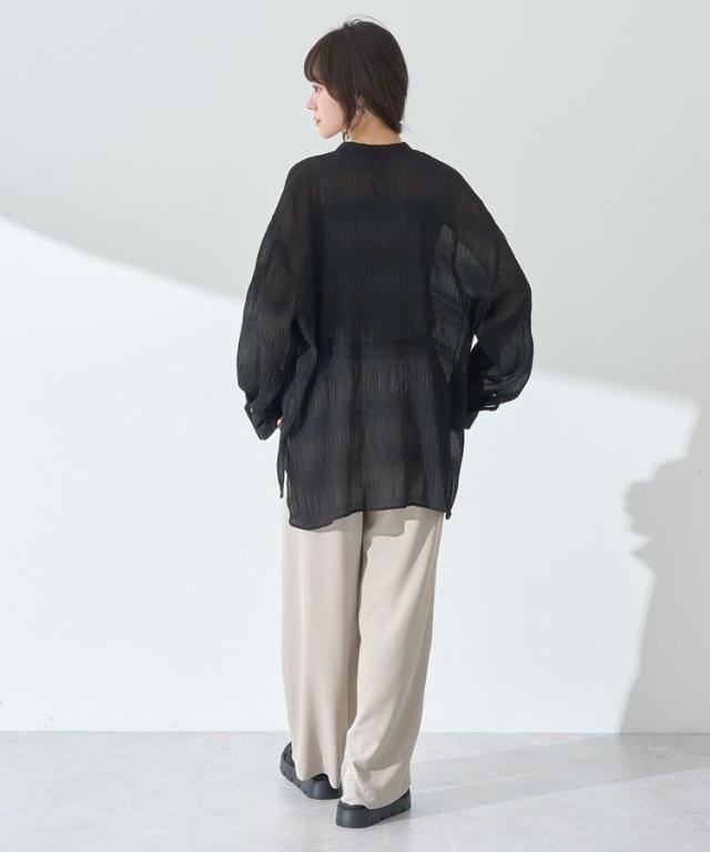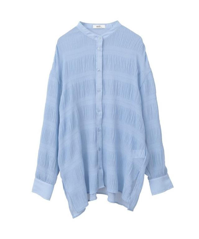 マジョリカプリーツを施した生地が表情豊かな雰囲気のシャツ。襟元はバンドカラーで仕立て、顔まわりをすっきりと演出します。腰までかかる長めの着丈でスタイルアップ効果にも期待。程よく透け感があり、インナーとのコントラストもお楽しみいただけるおすすめのアイテムです。透け感[ややあり]