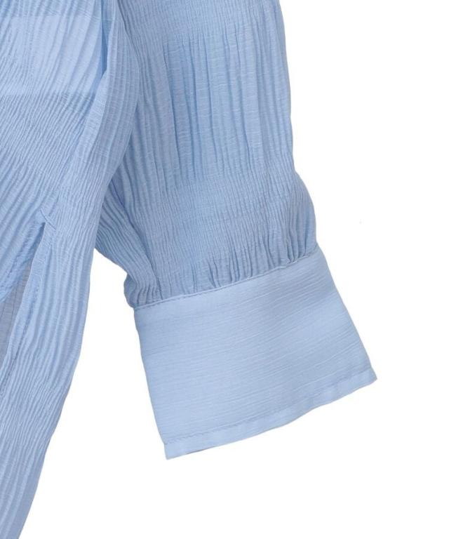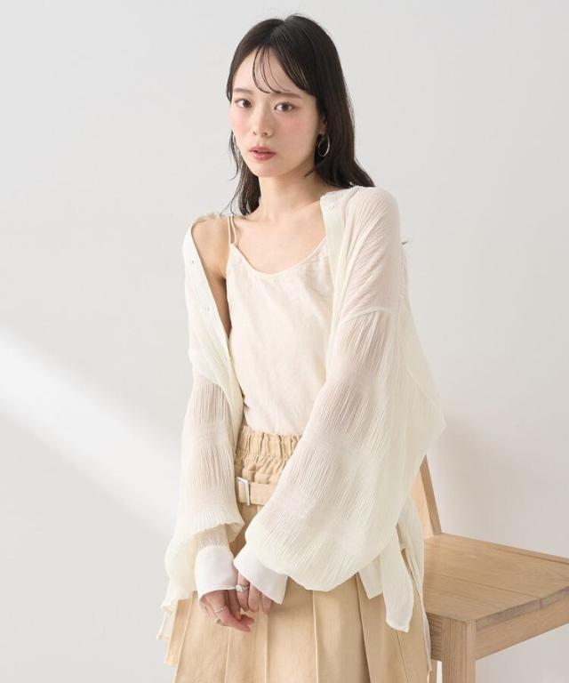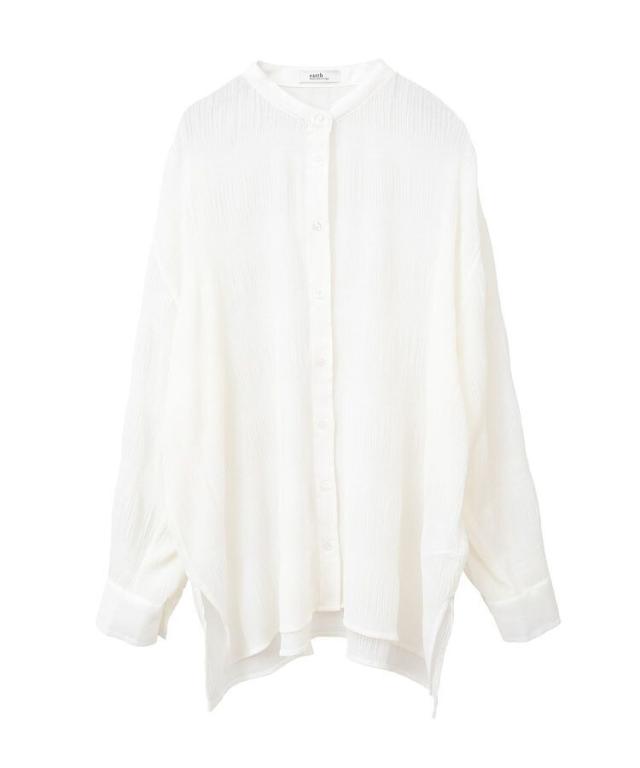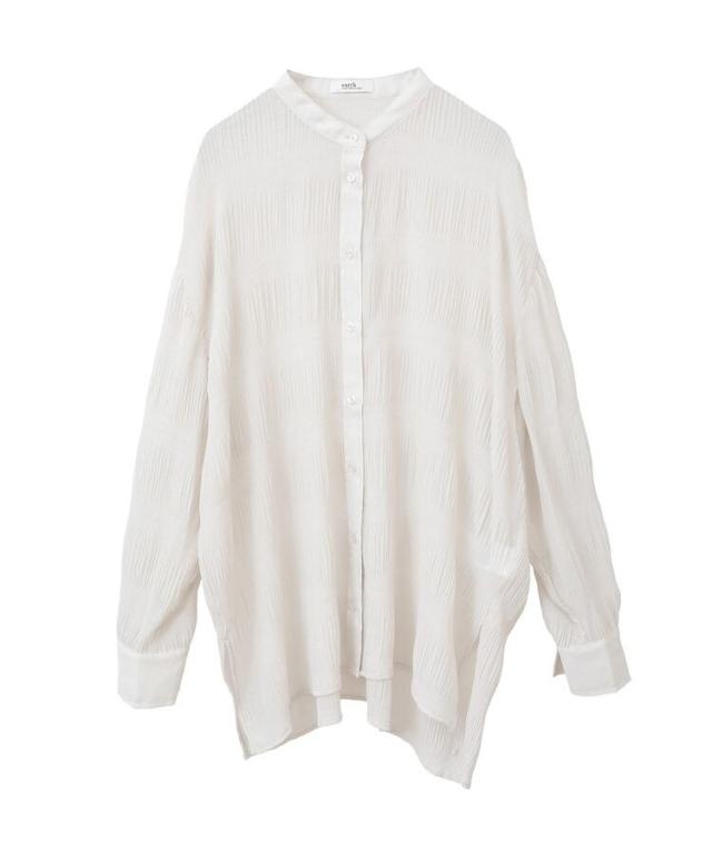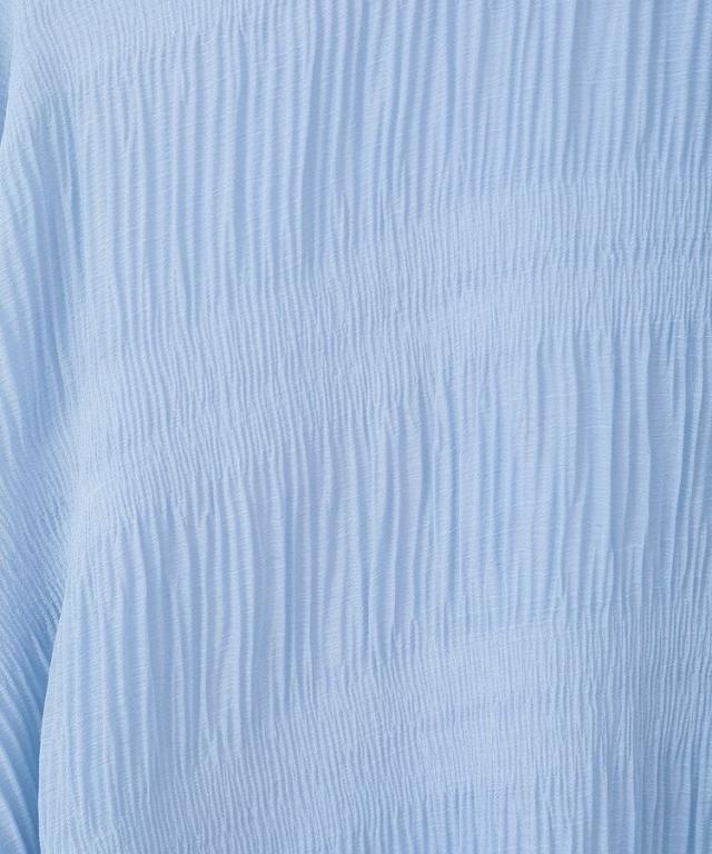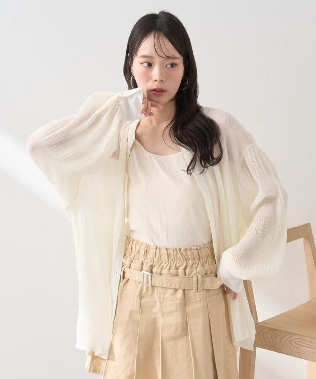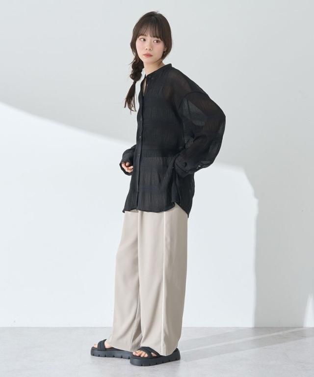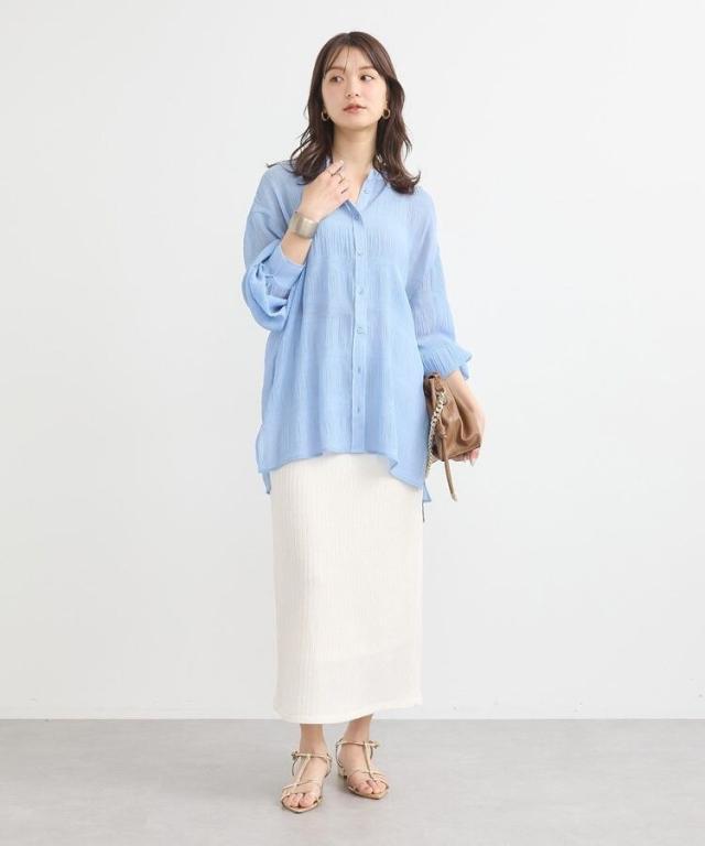 マジョリカプリーツを施した生地が表情豊かな雰囲気のシャツ。襟元はバンドカラーで仕立て、顔まわりをすっきりと演出します。腰までかかる長めの着丈でスタイルアップ効果にも期待。程よく透け感があり、インナーとのコントラストもお楽しみいただけるおすすめのアイテムです。透け感[ややあり]