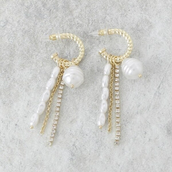ゴールドのツイストフープと、揺れるチェーンにあしらわれたパール調使いとクリスタル使いのコンビネーションが華やかさを引き立て、顔周りに明るさをもたらします。