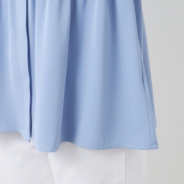 とろみ感のある素材にパール調ボタンをあしらい、オフィスウェアとしても着用できるようより上品見えに仕上げました。