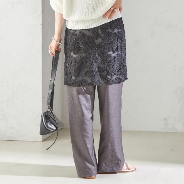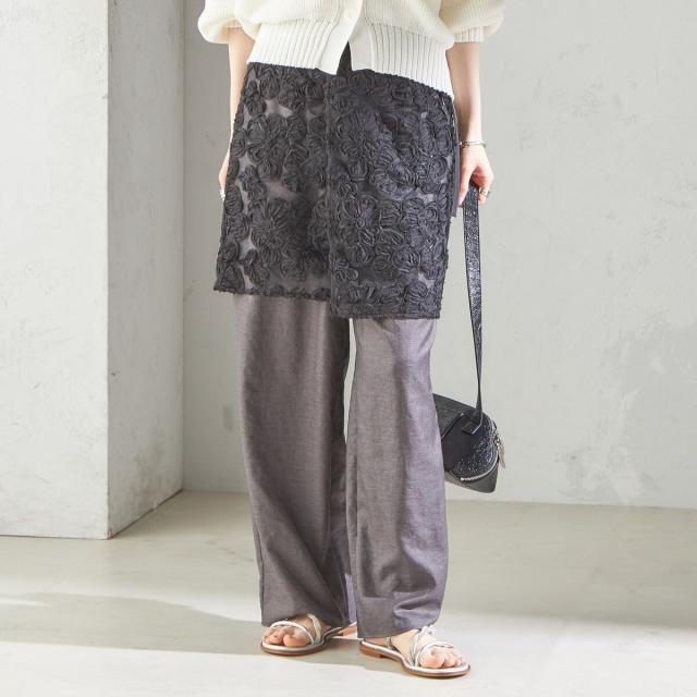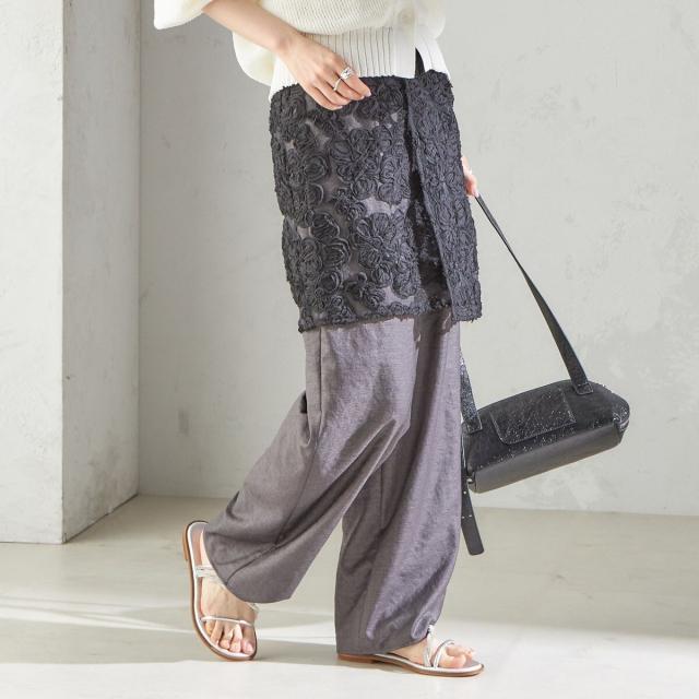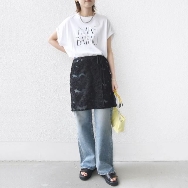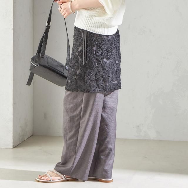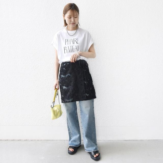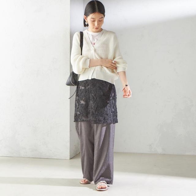いつものスタイリングに女性らしさをプラスしながら、こなれ感を演出できるチュールラップスカート。