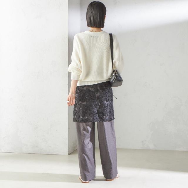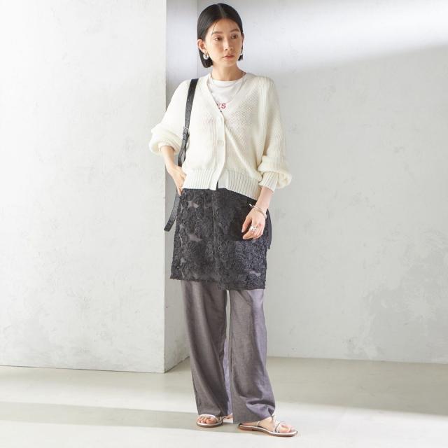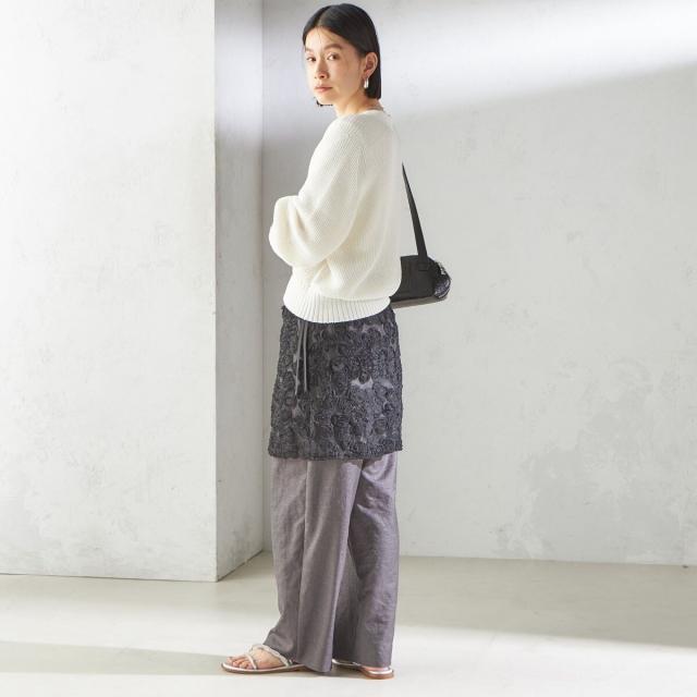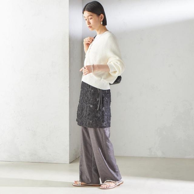 軽やかな印象の膝上丈で、チュニック丈のトップスの裾から覗かせたり、ボトムスなどの幅広いアイテムとレイヤリングをお楽しみいただけます。