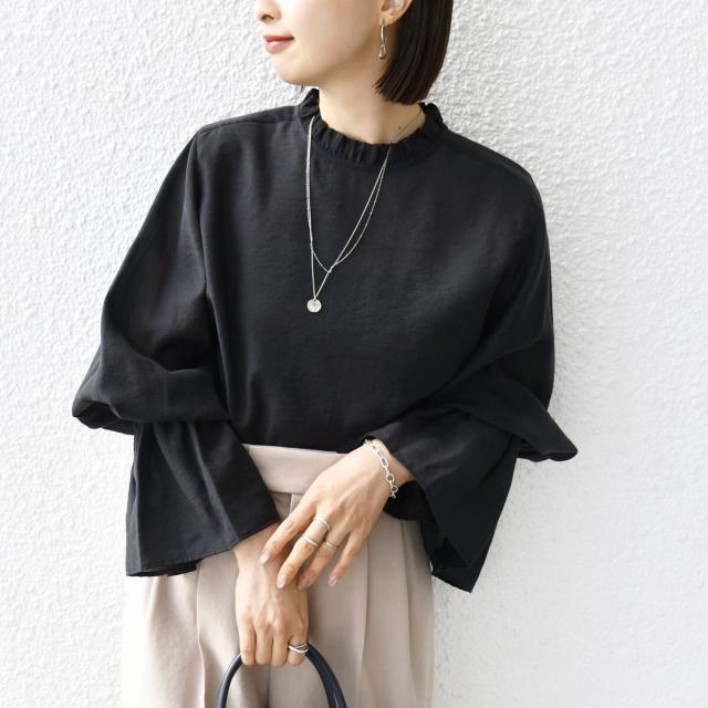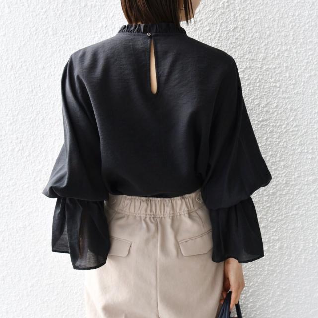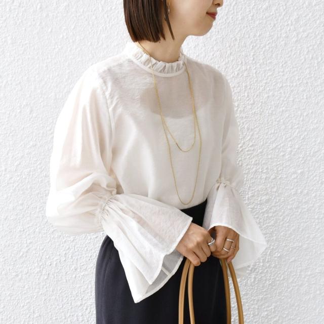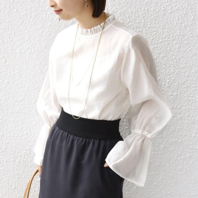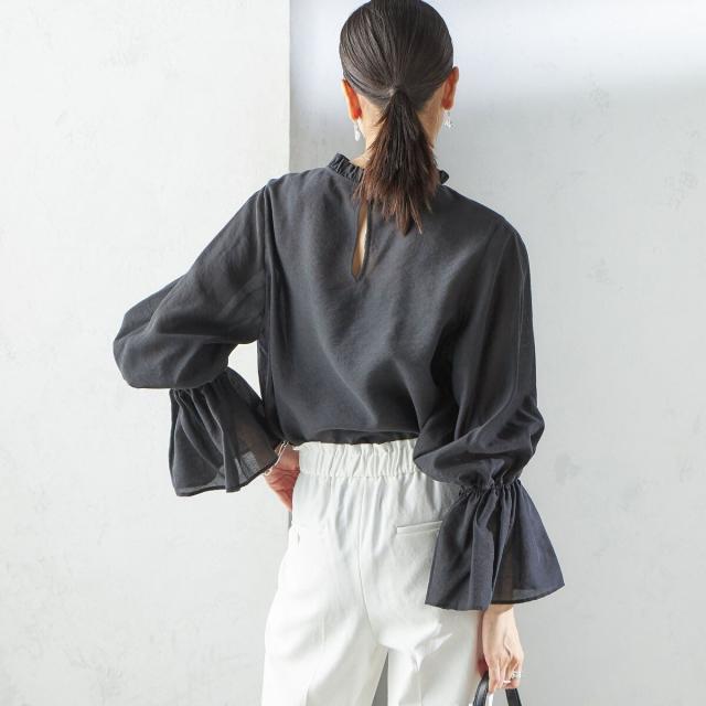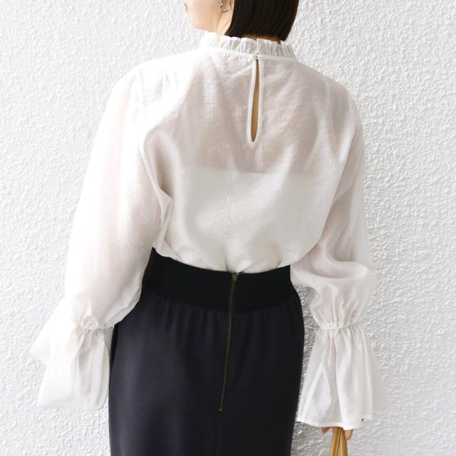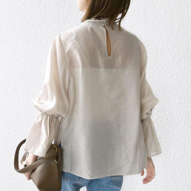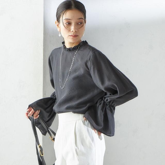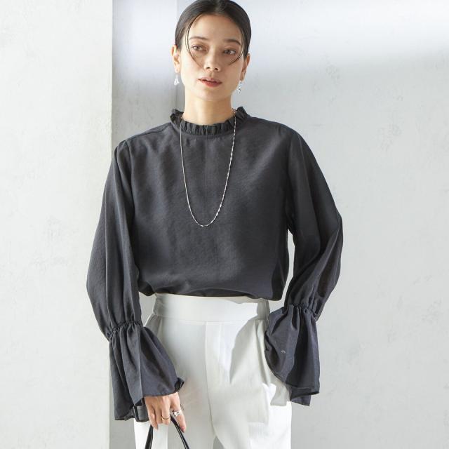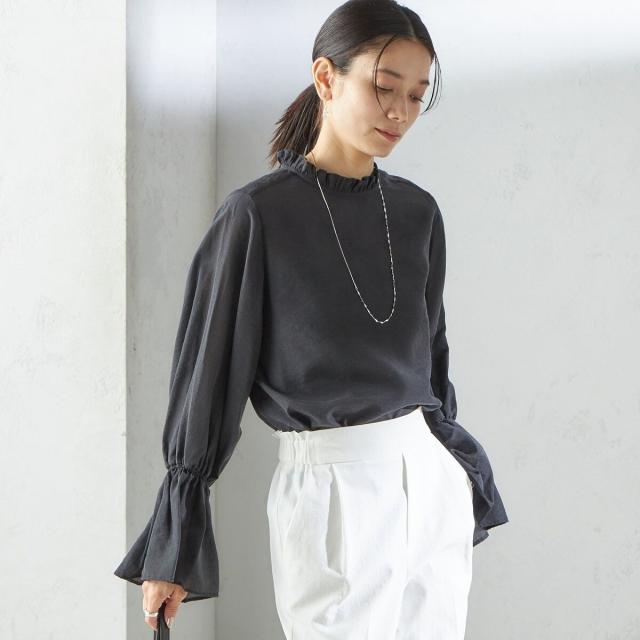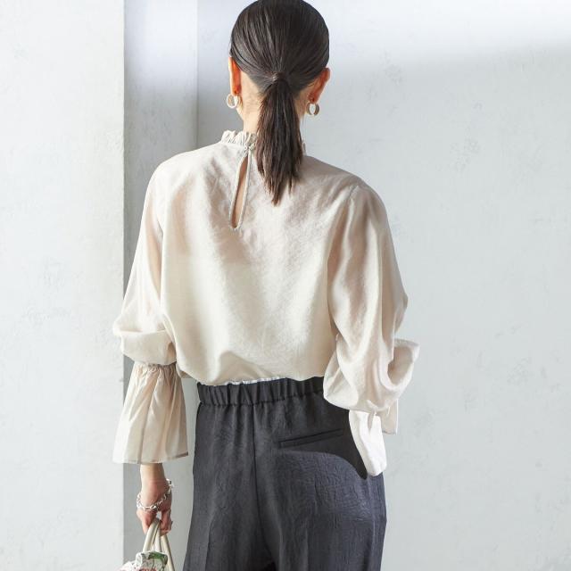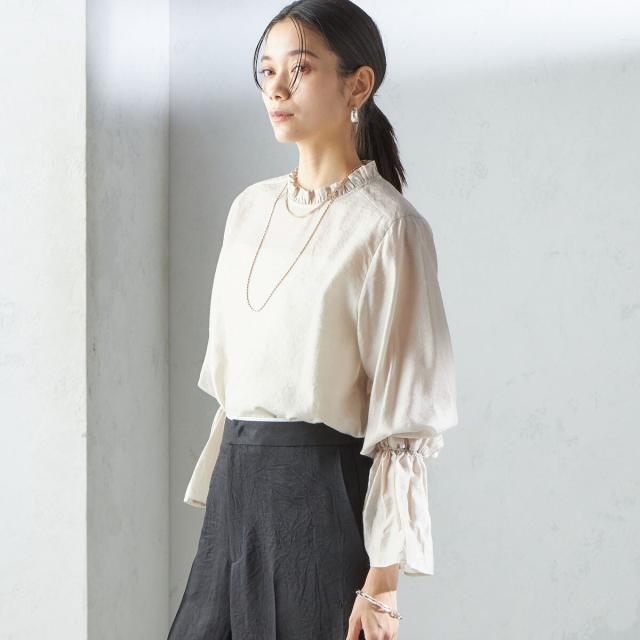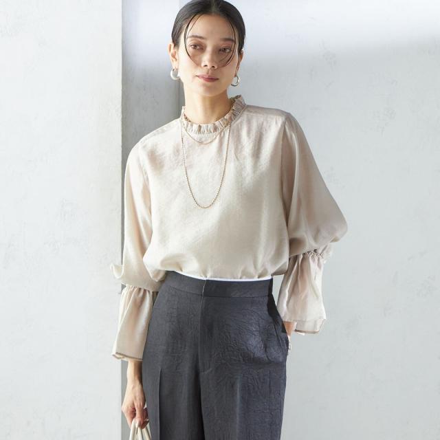 衿フリルと袖口のボリュームにこだわり、ジャケットインでも1枚でも華やかに見せてくれます。